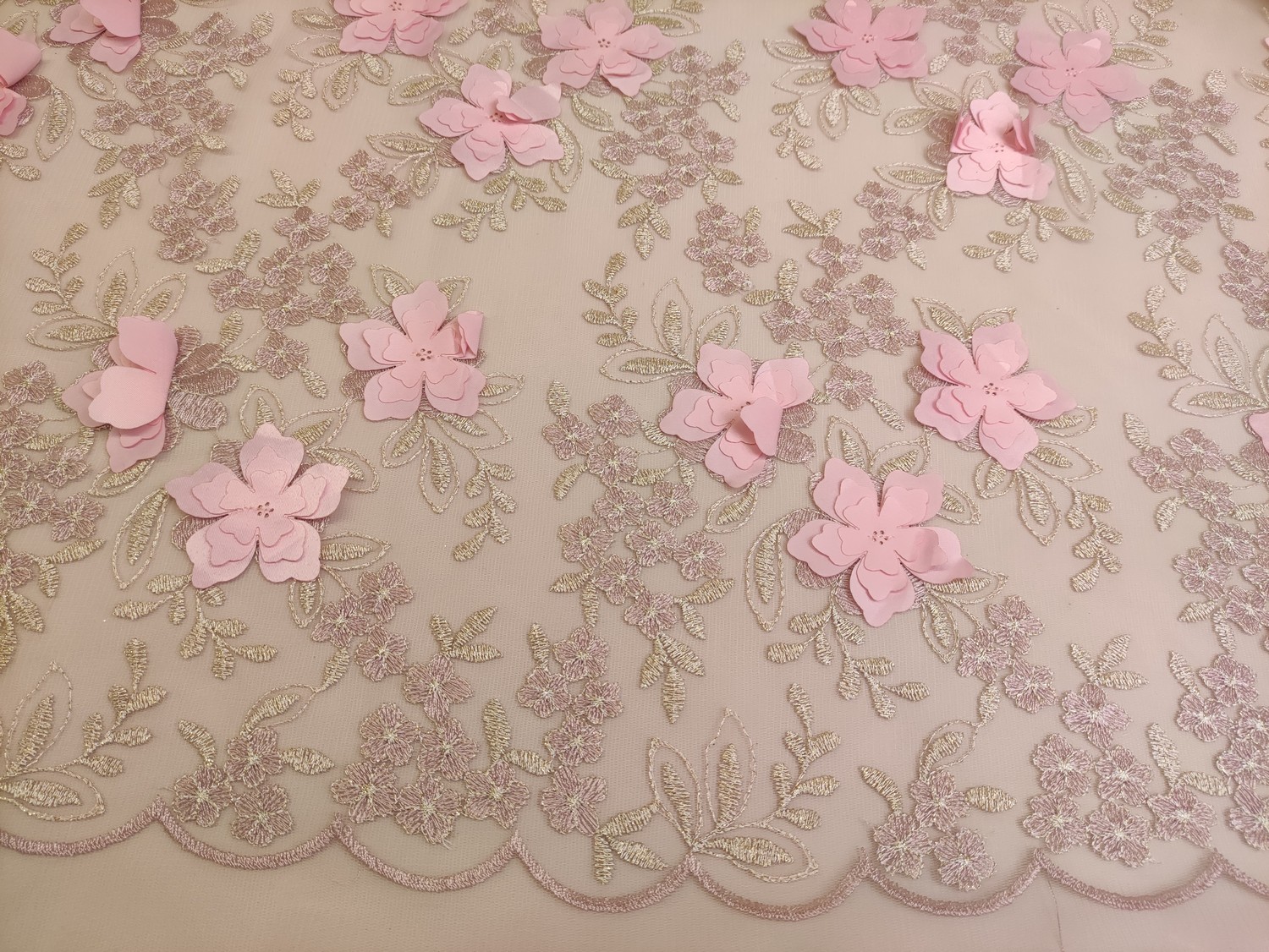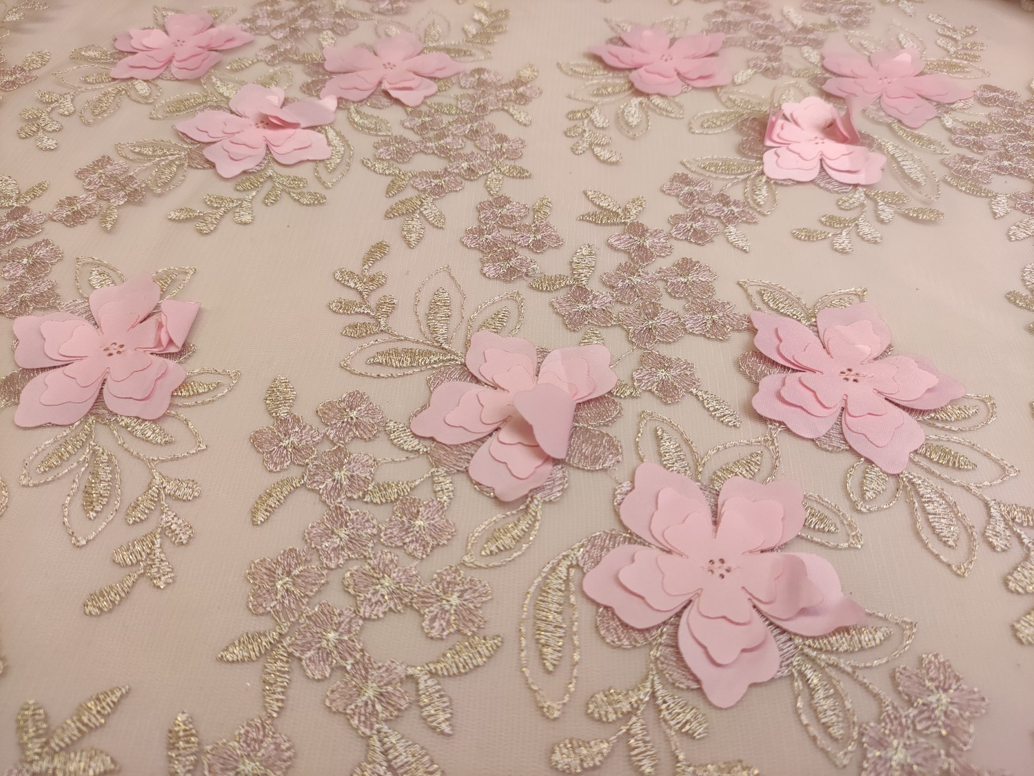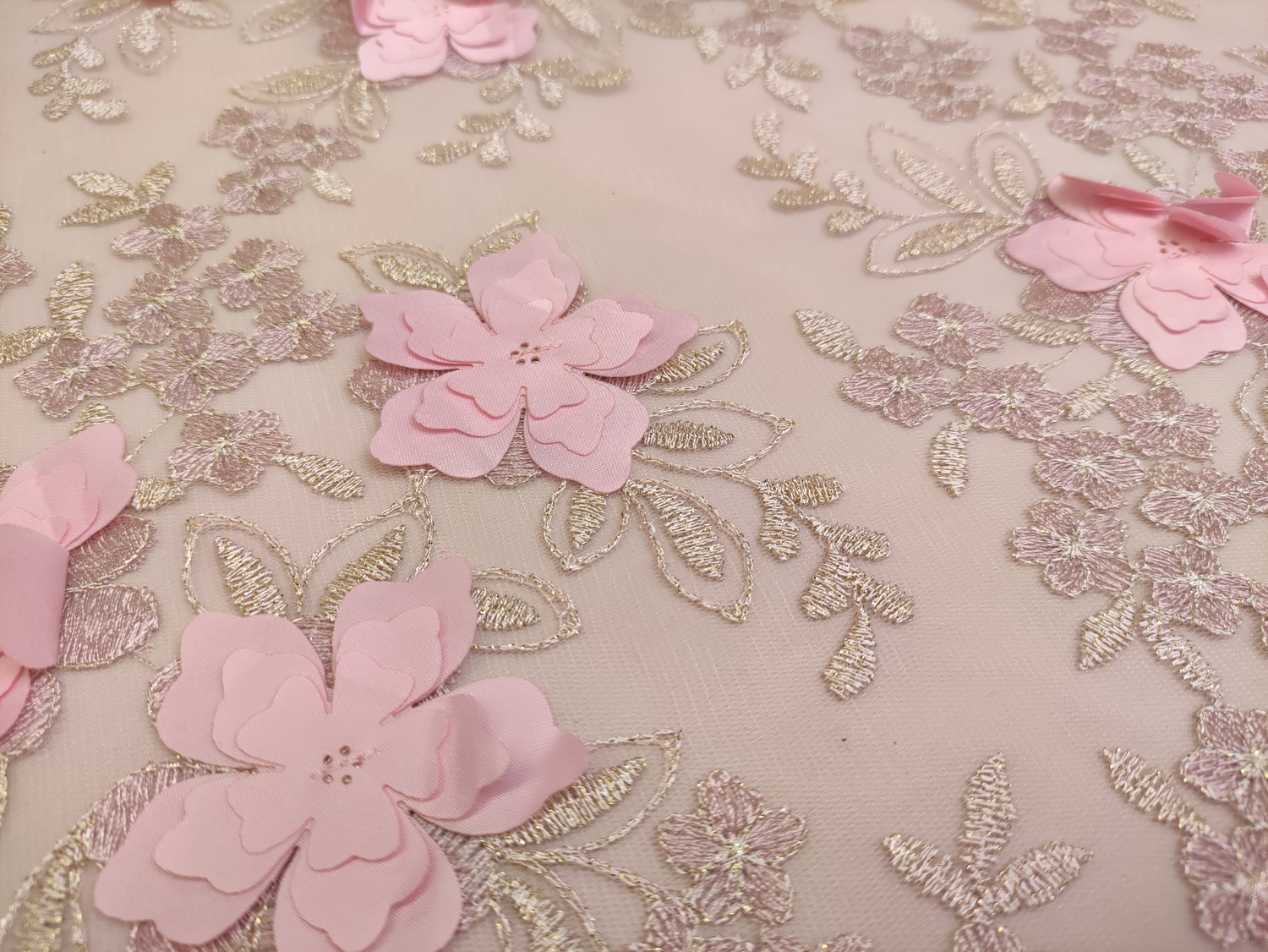 Tessuto Tulle mano seta ricamato con fiori in 3D dalla mano morbida, voluminosa e fluente, ideale per creare capi sartoriali da cerimonia e per le grandi occasioni originali e alla moda.