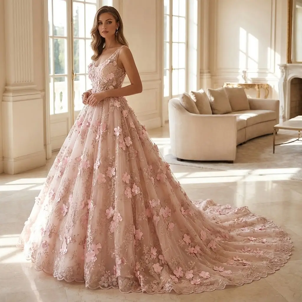 Tessuto Tulle mano seta ricamato con fiori in 3D rosa chiaro – beige