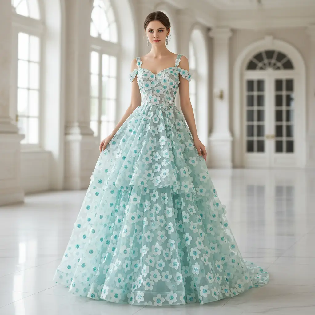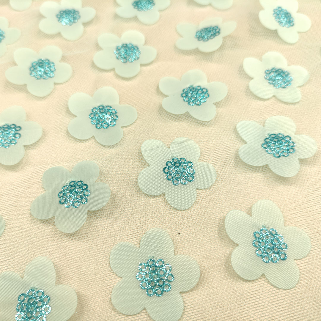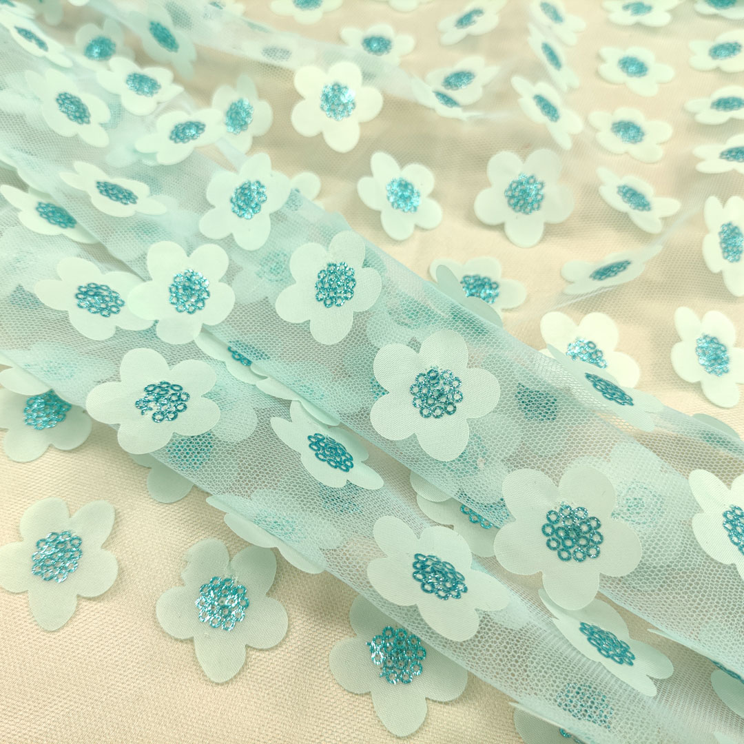 Tessuto Tulle mano seta ricamato con fiori in 3D turchese