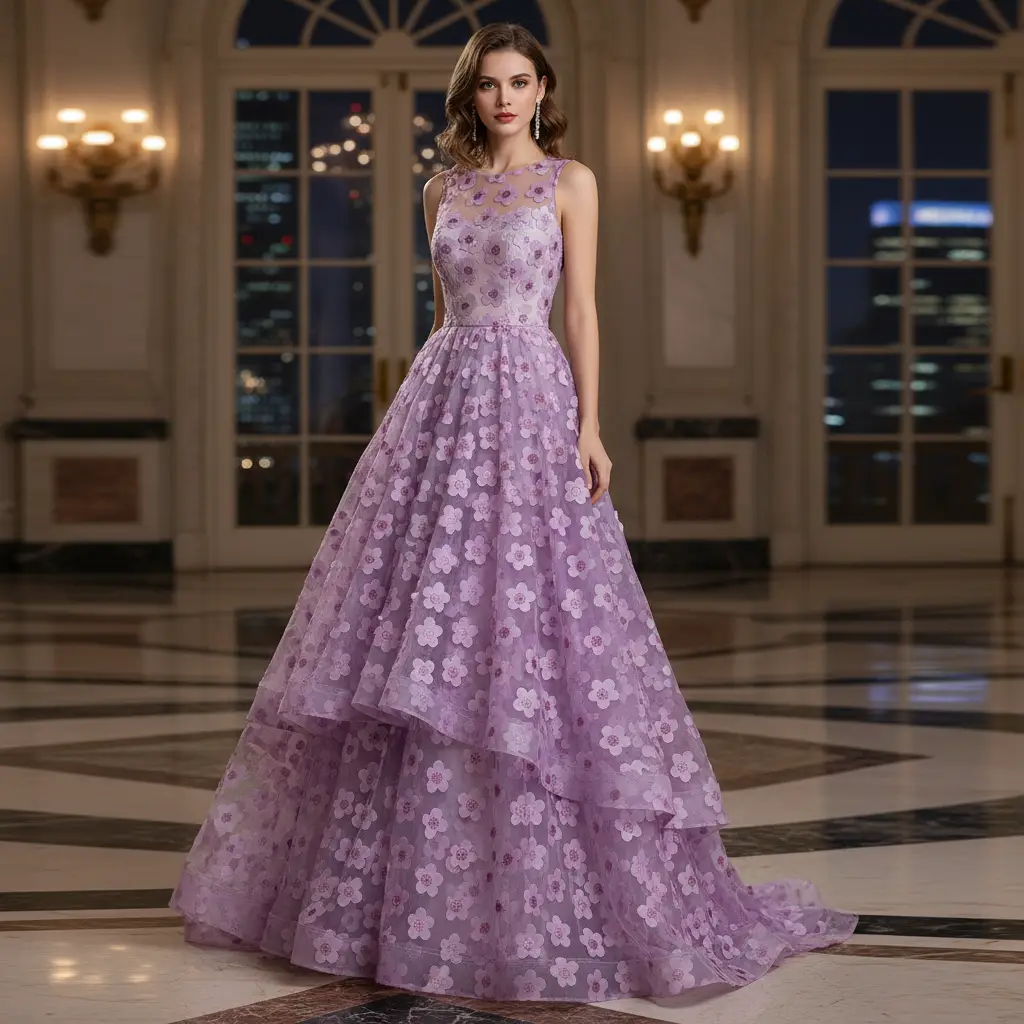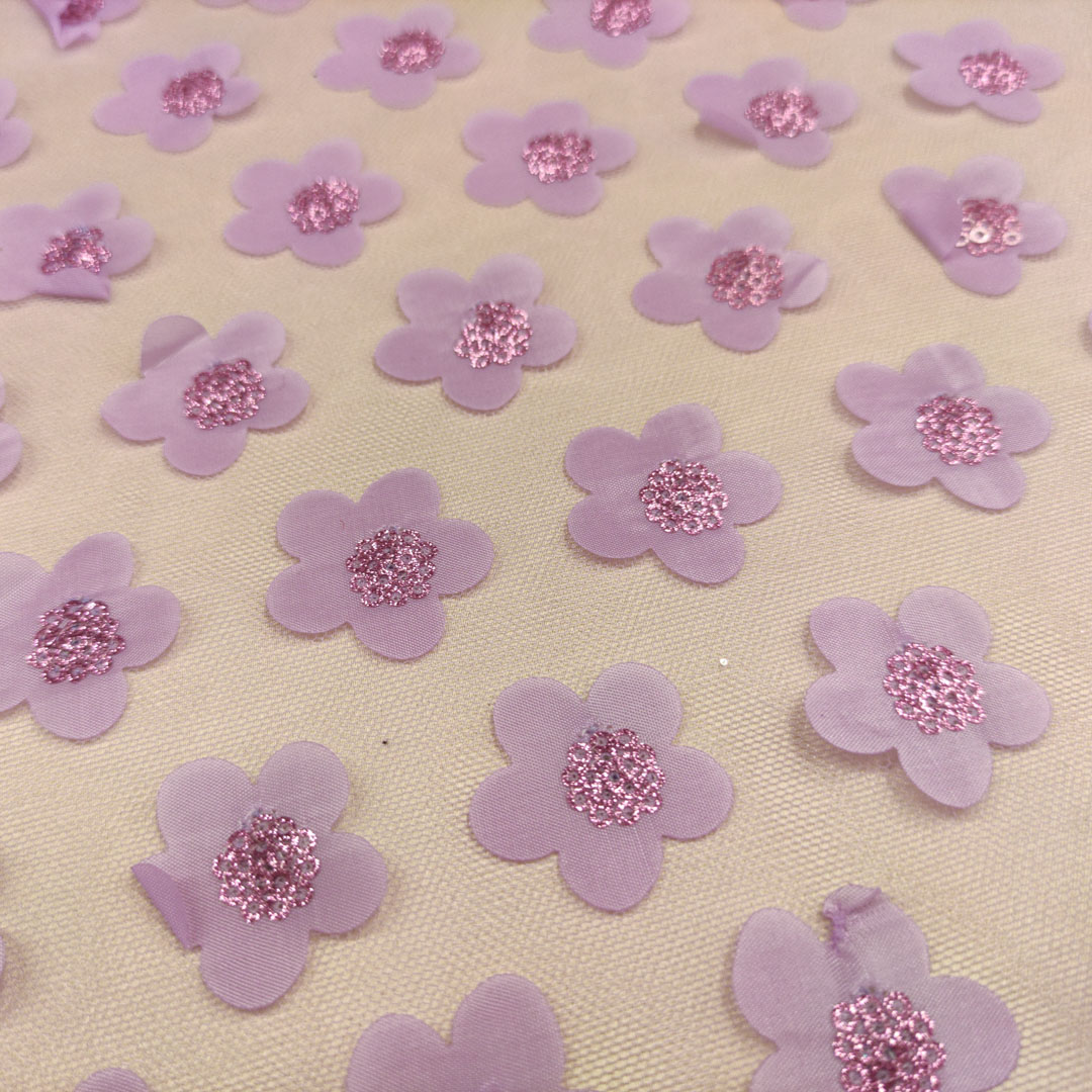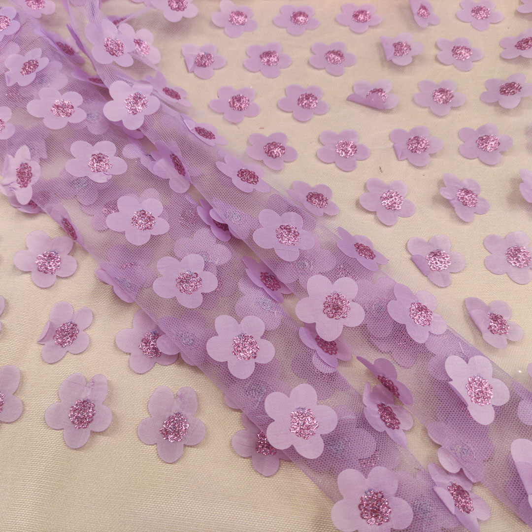 Tessuto Tulle mano seta ricamato con fiori in 3D viola