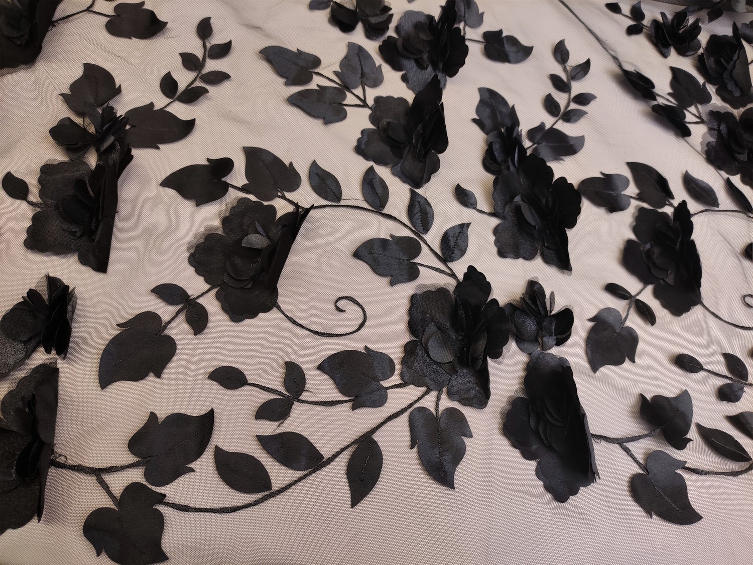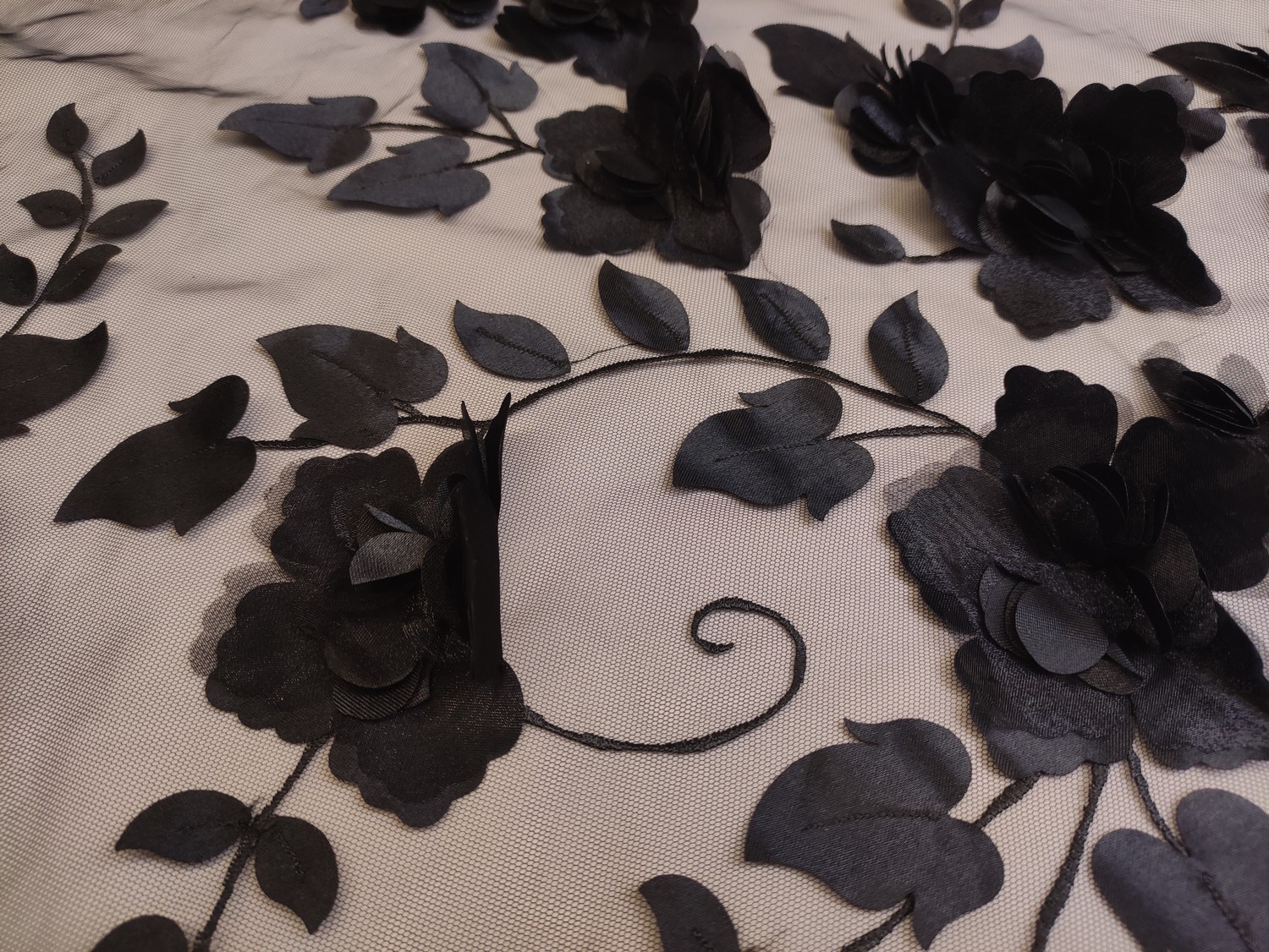 Tessuto Tulle mano seta ricamato con fiori in satin 3D nero