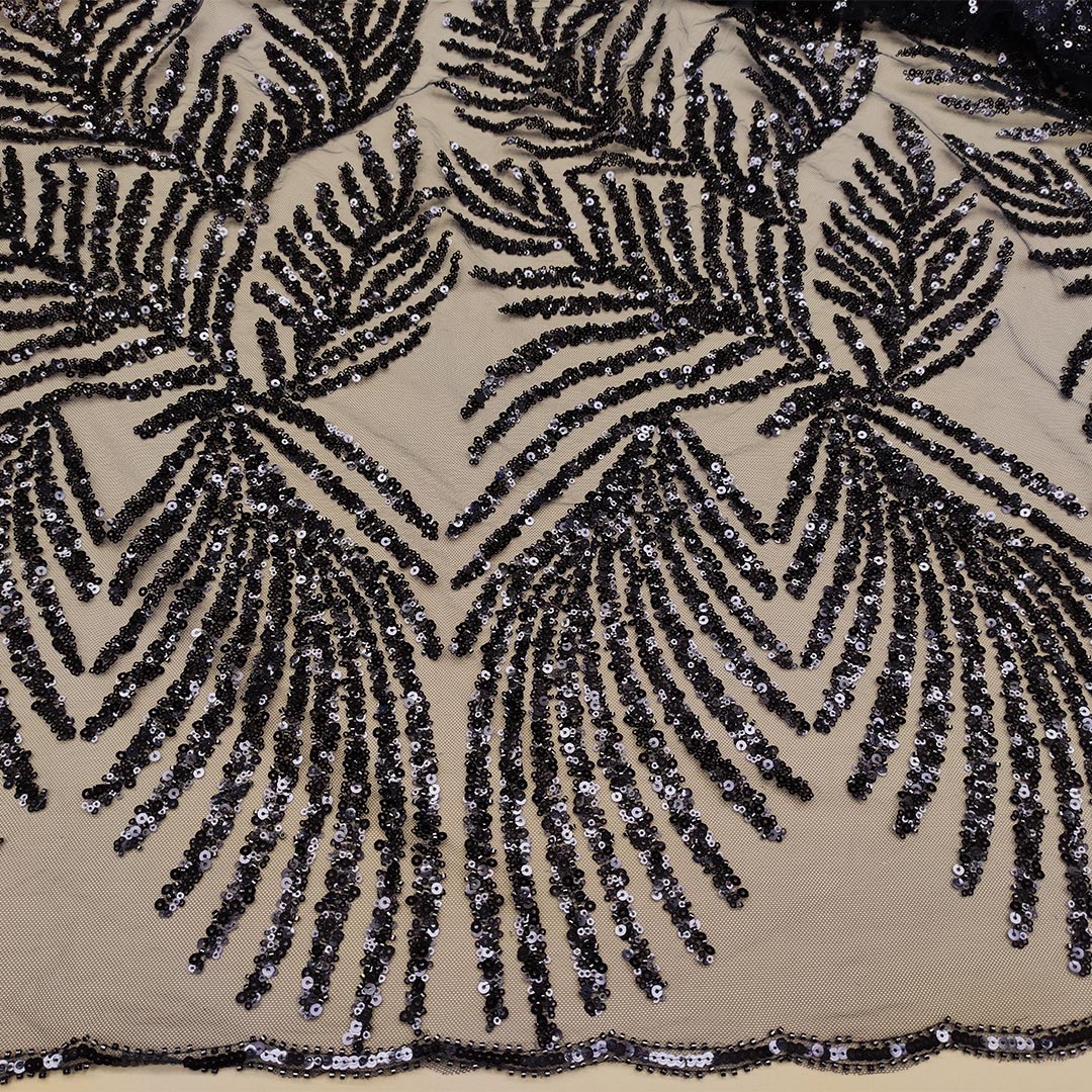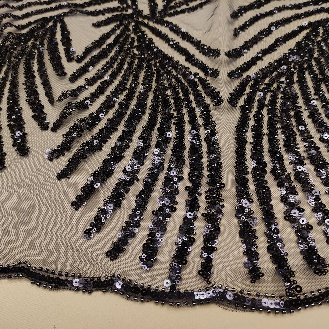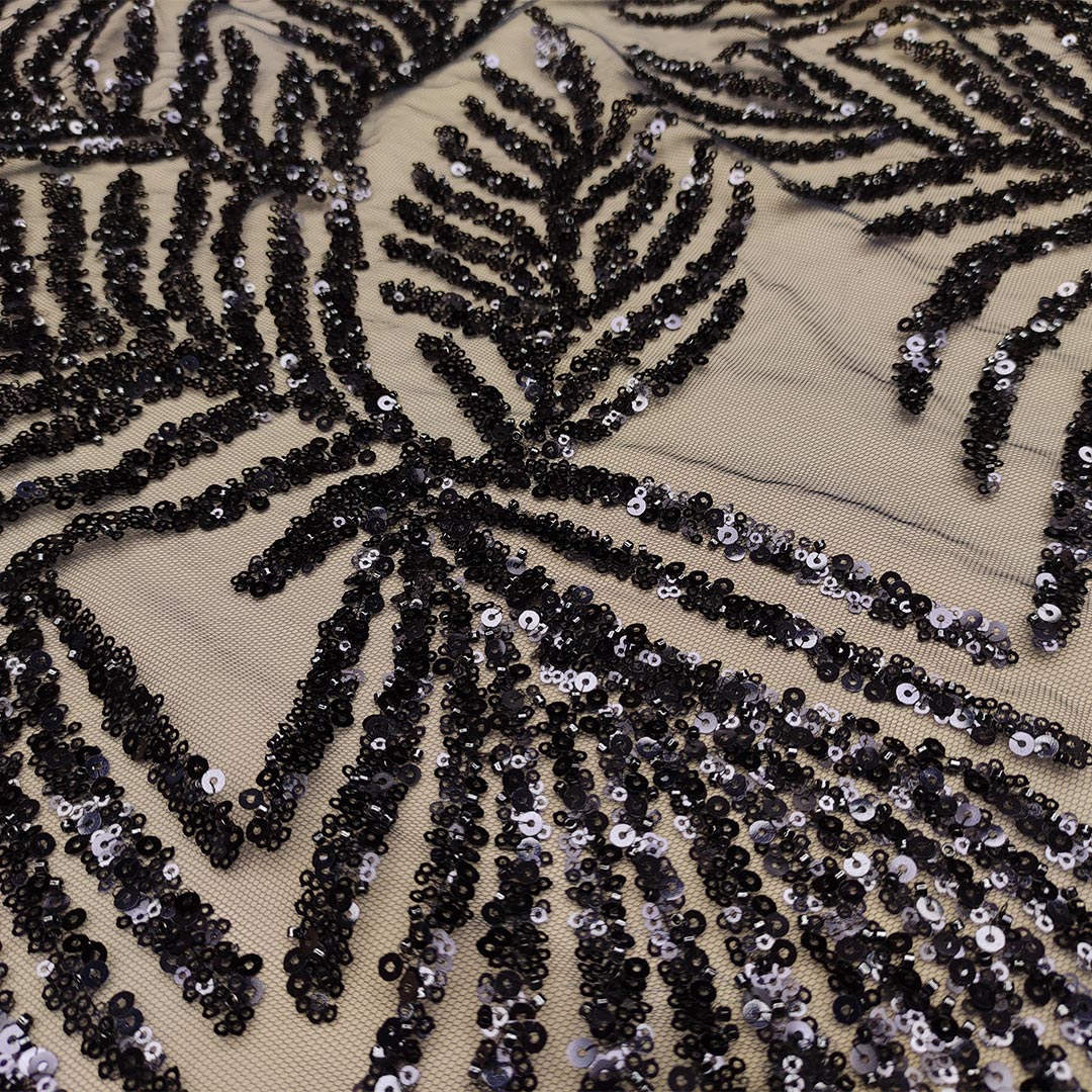 Tessuto Tulle mano seta ricamato con paillettes e con perline motivo astratto blu notte