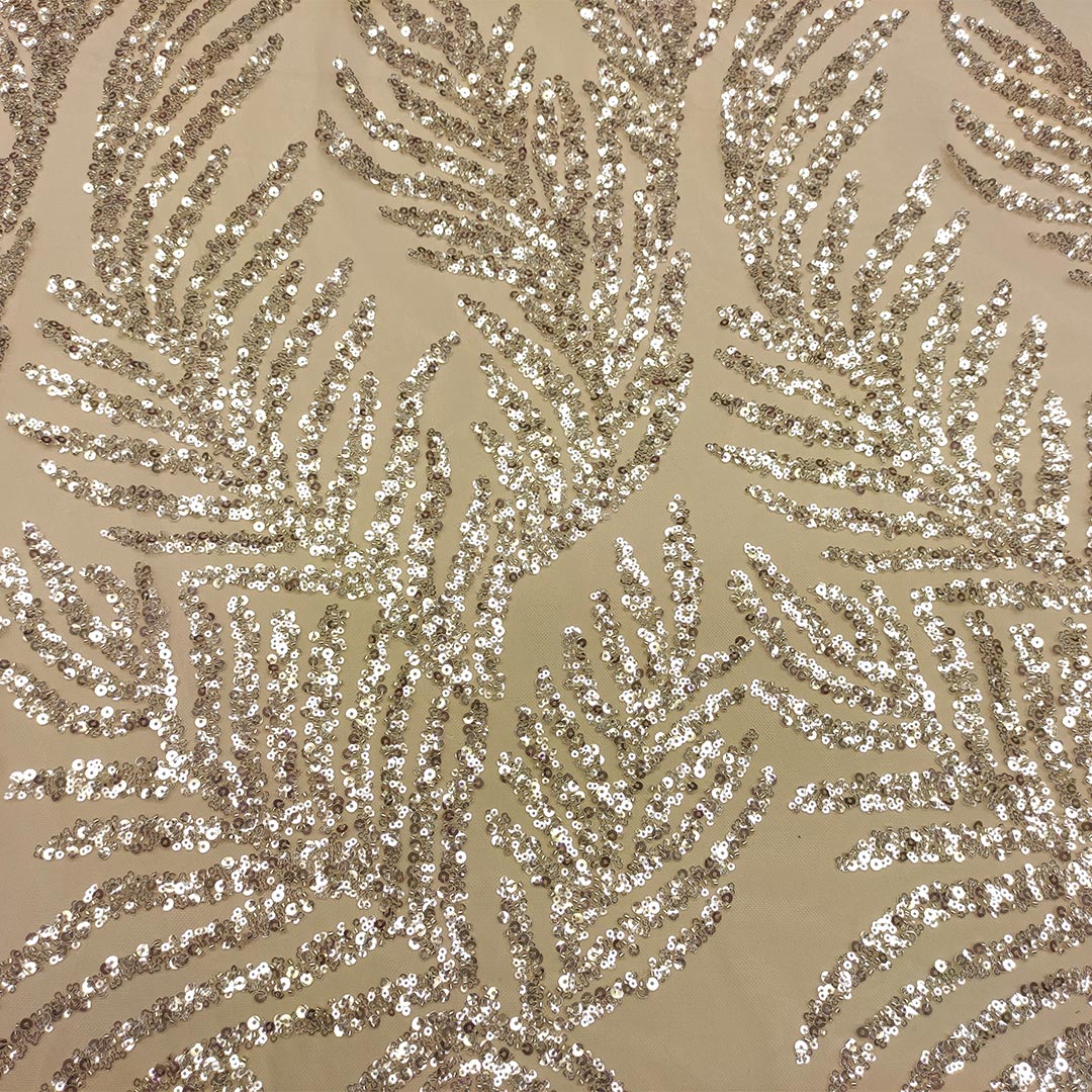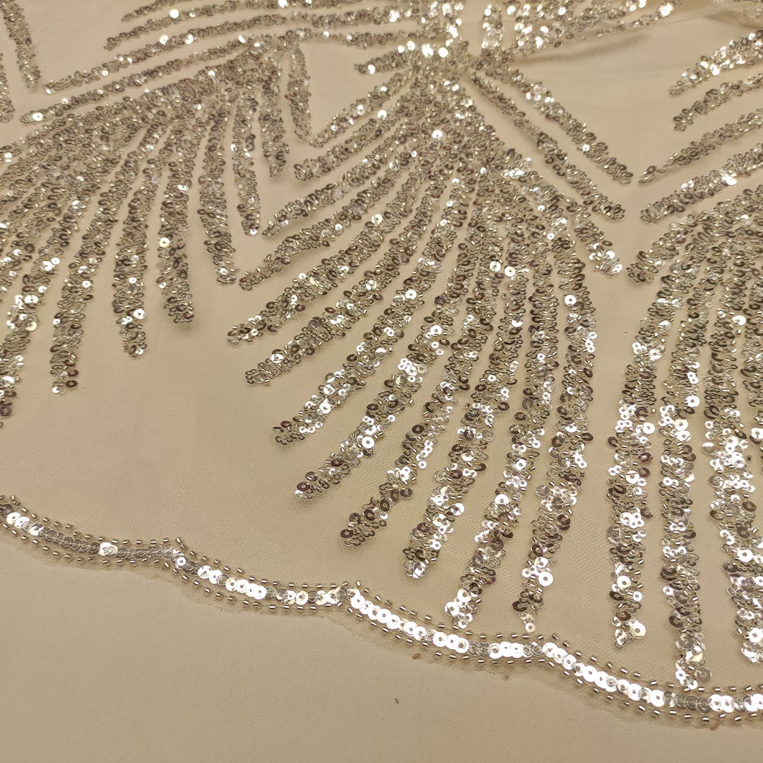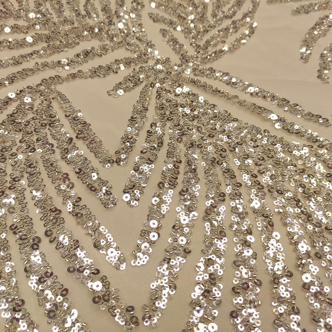 Tessuto Tulle mano seta ricamato con paillettes e con perline motivo astratto champagne