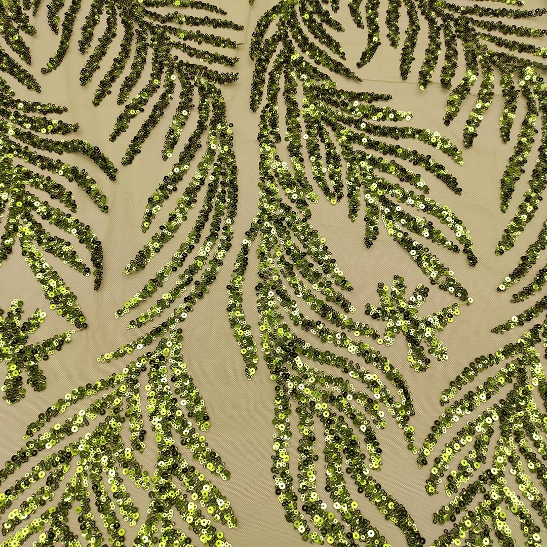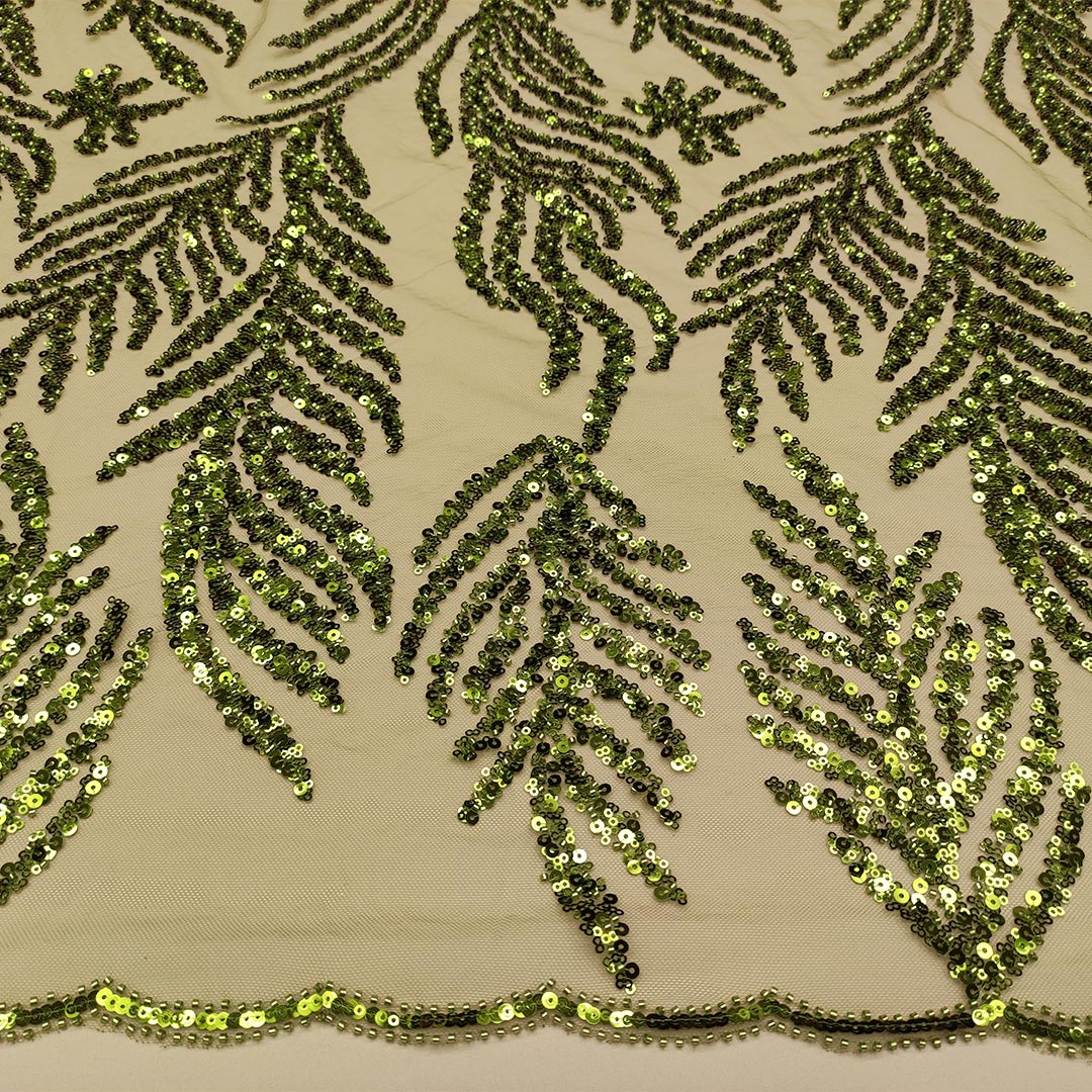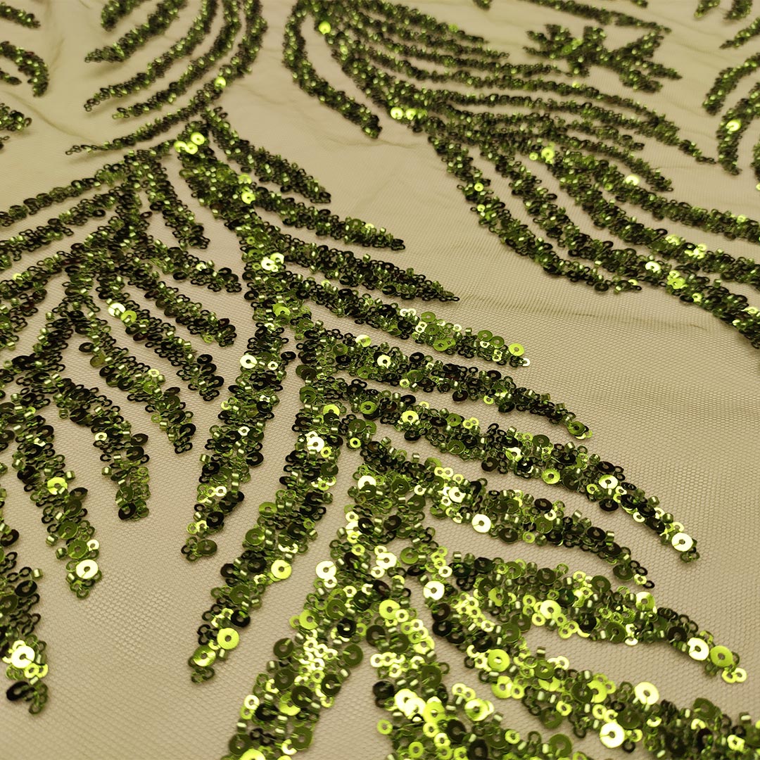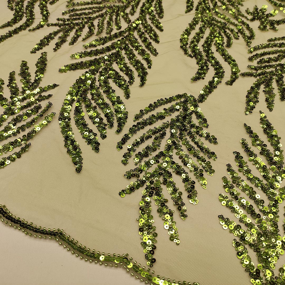 Tessuto Tulle mano seta ricamato con paillettes e con perline motivo astratto verde acido