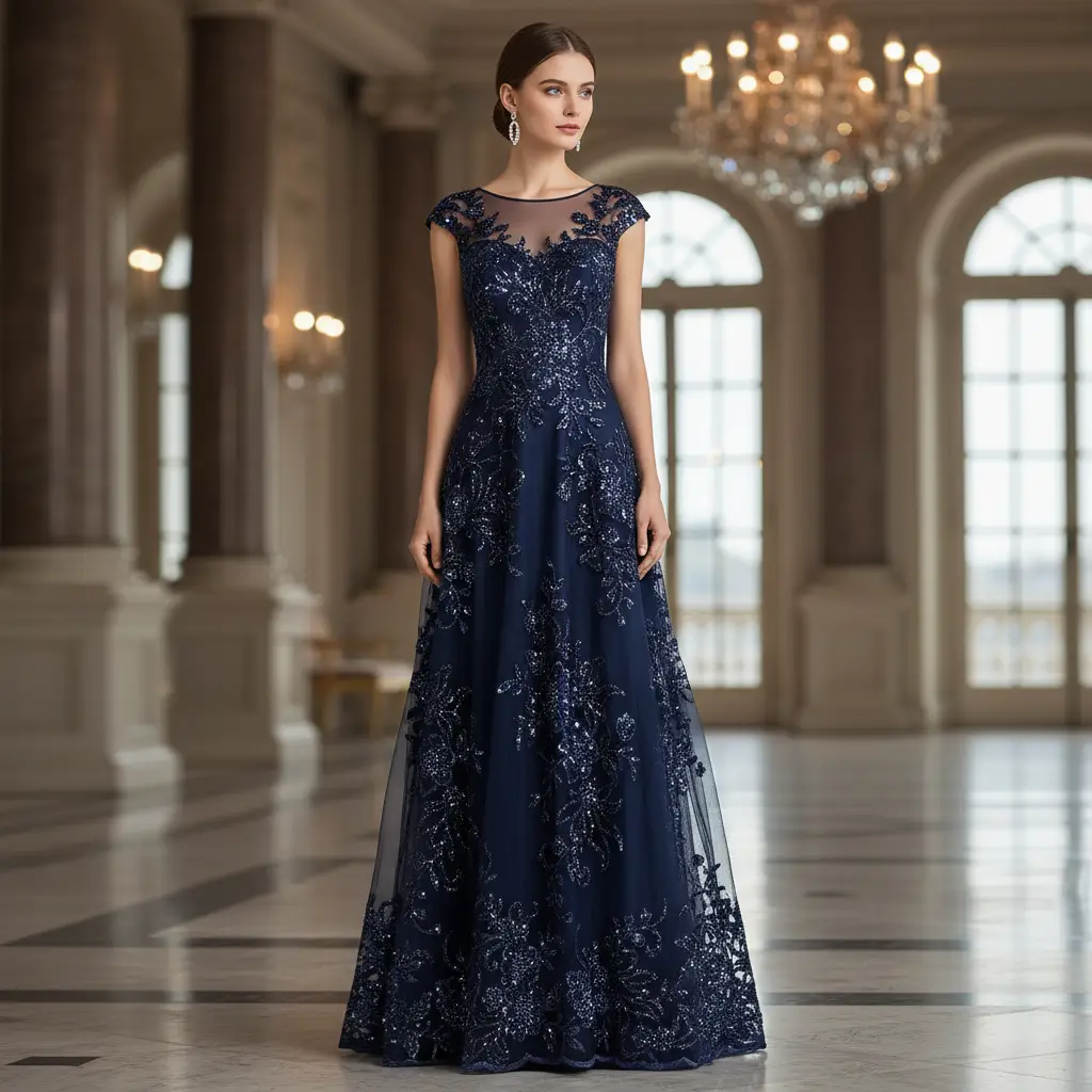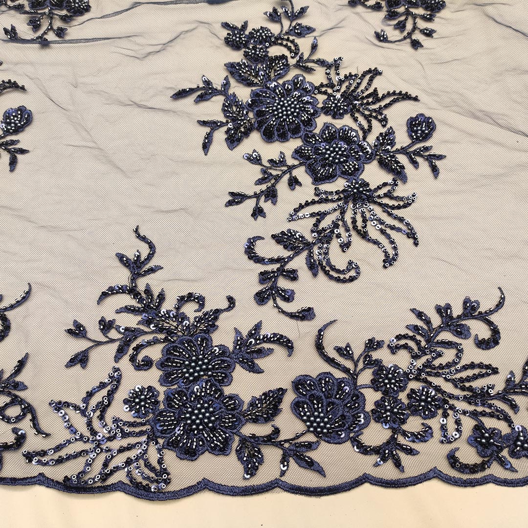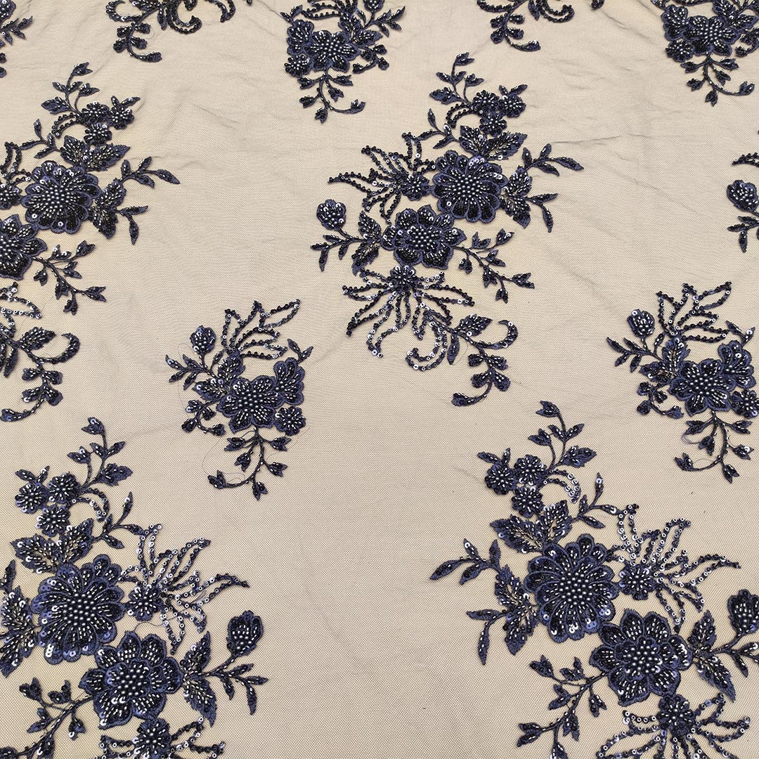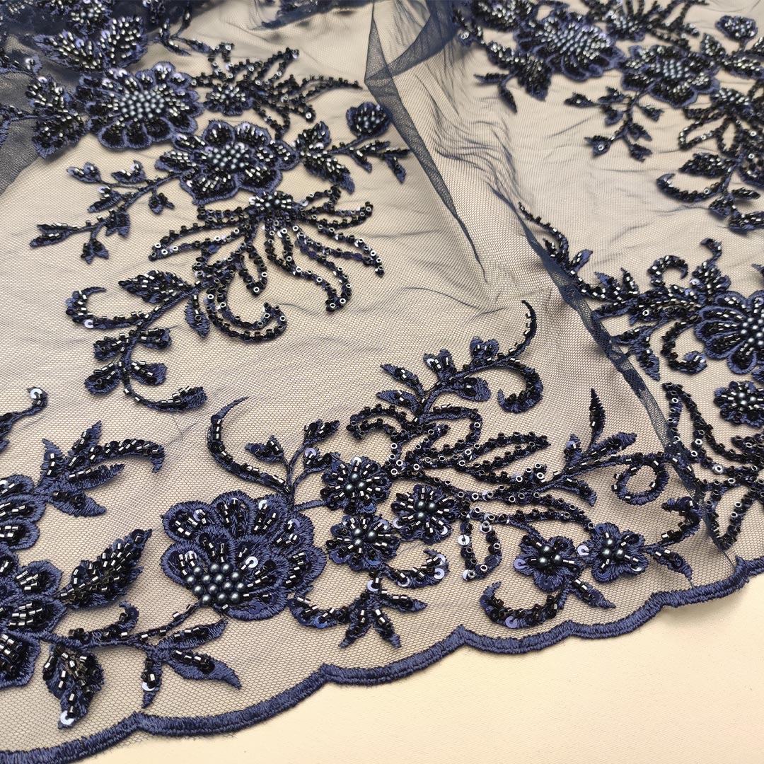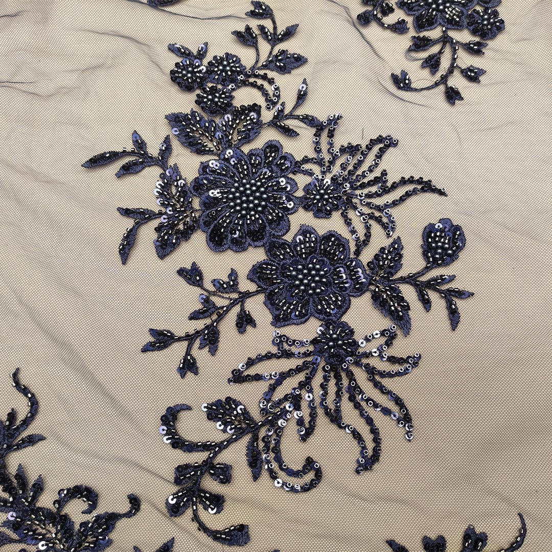 Tessuto Tulle mano seta ricamato con paillettes e con perline motivo floreale blu notte