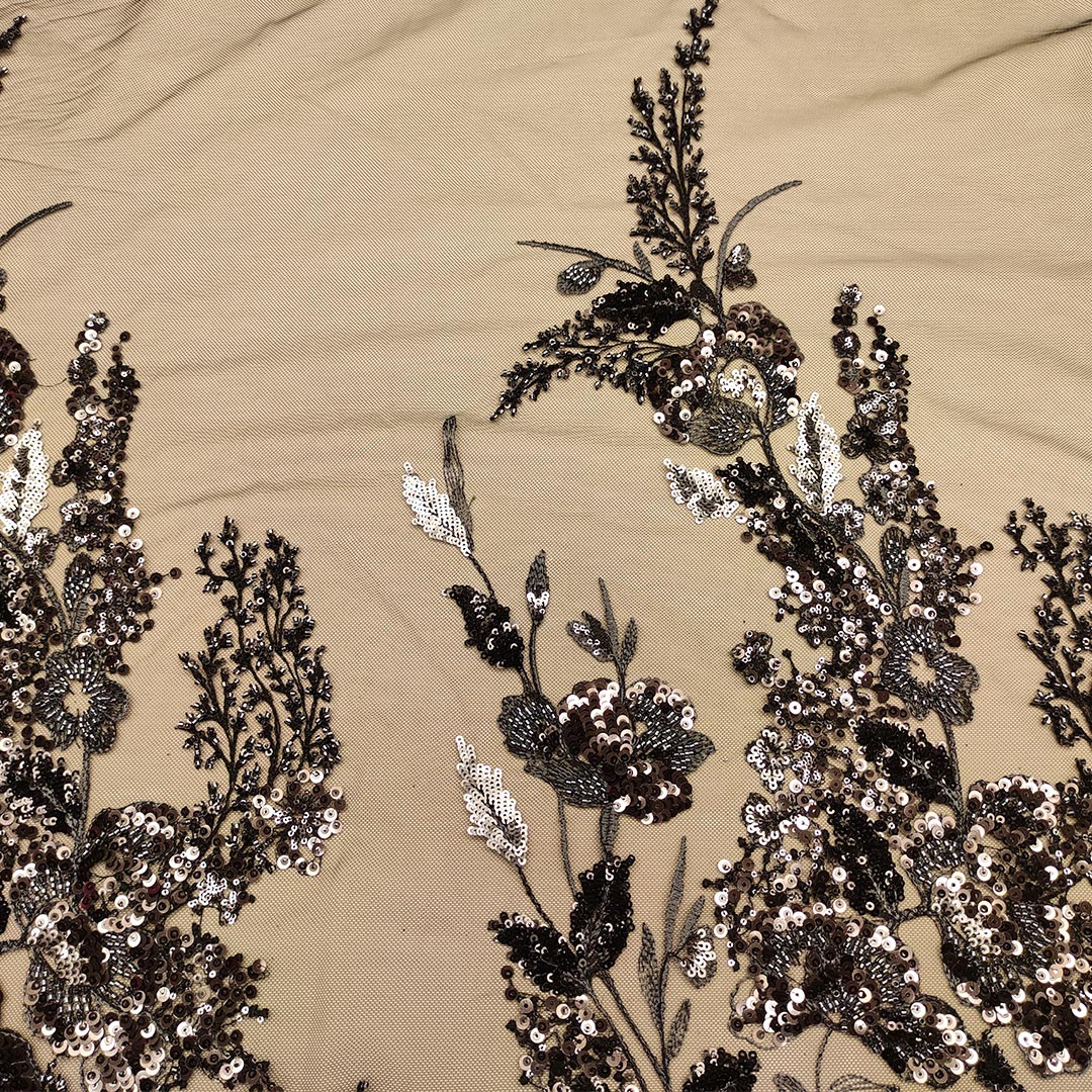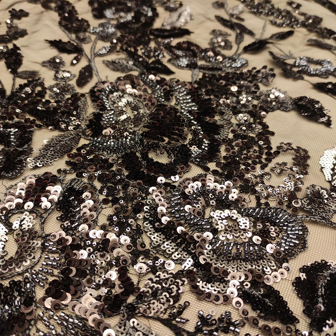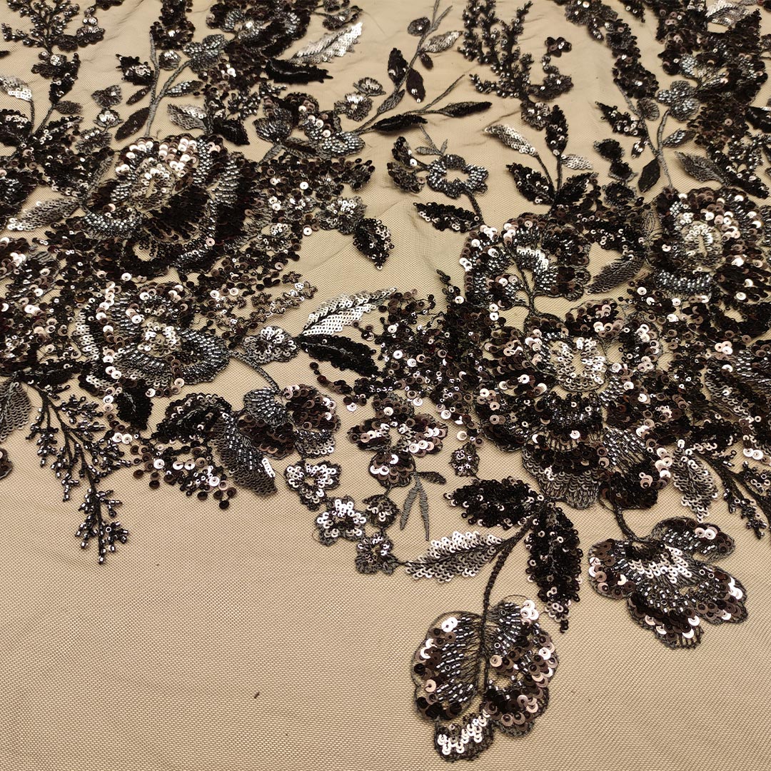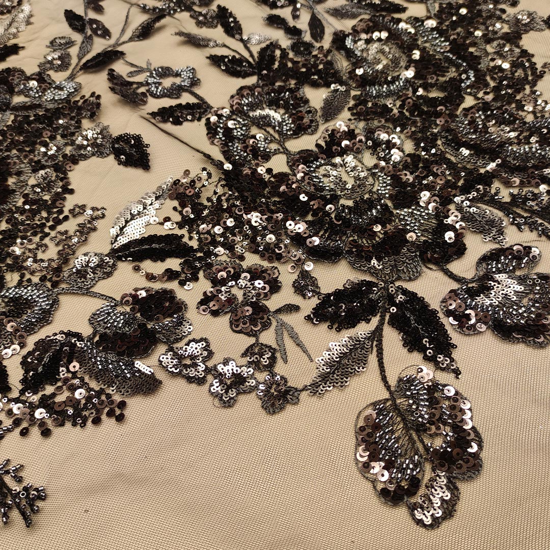 Tessuto Tulle mano seta ricamato con paillettes e con perline motivo floreale nero