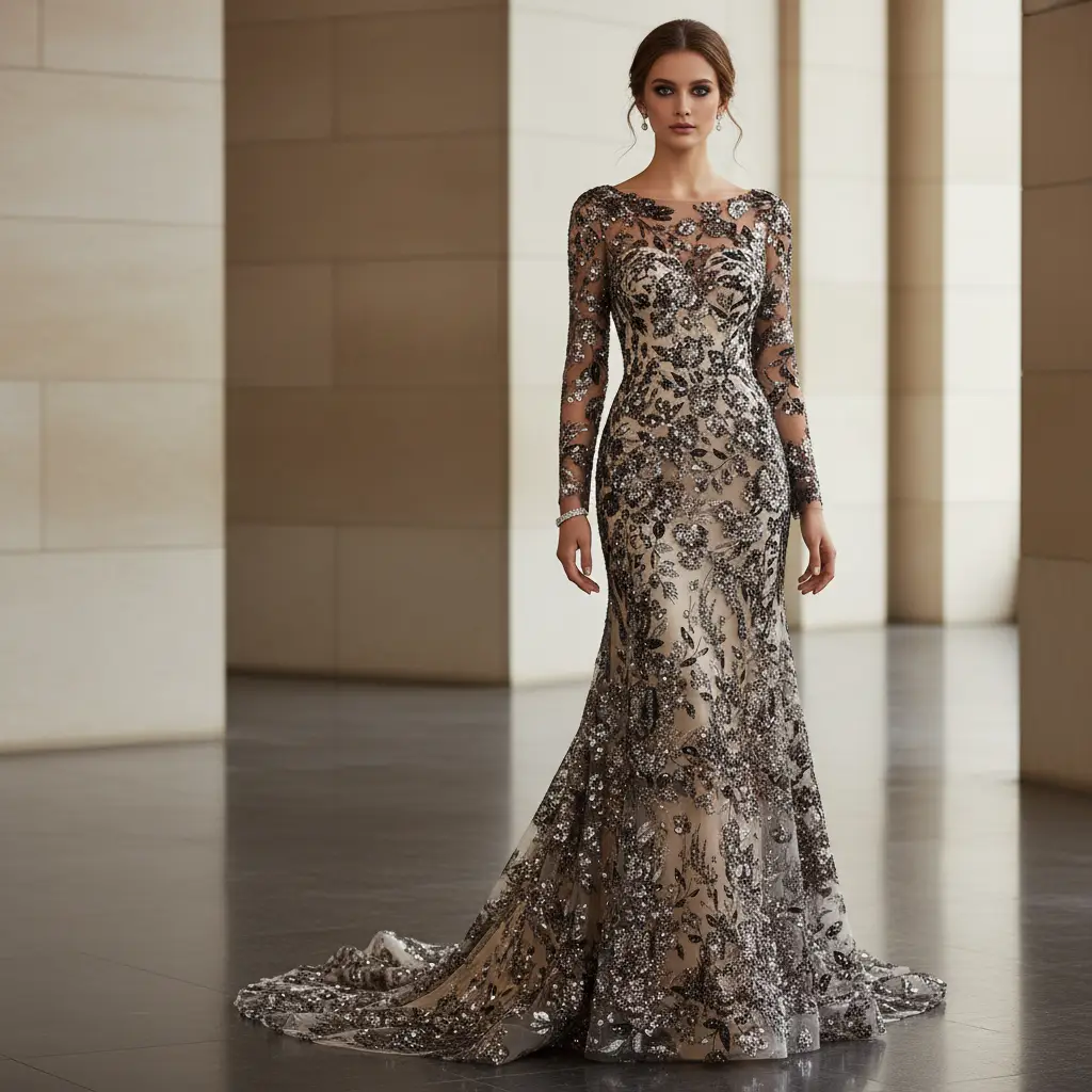 Tessuto Tulle mano seta ricamato con perline e con paillettes ideale per realizzare capi da cerimonia esclusivi ed eleganti.