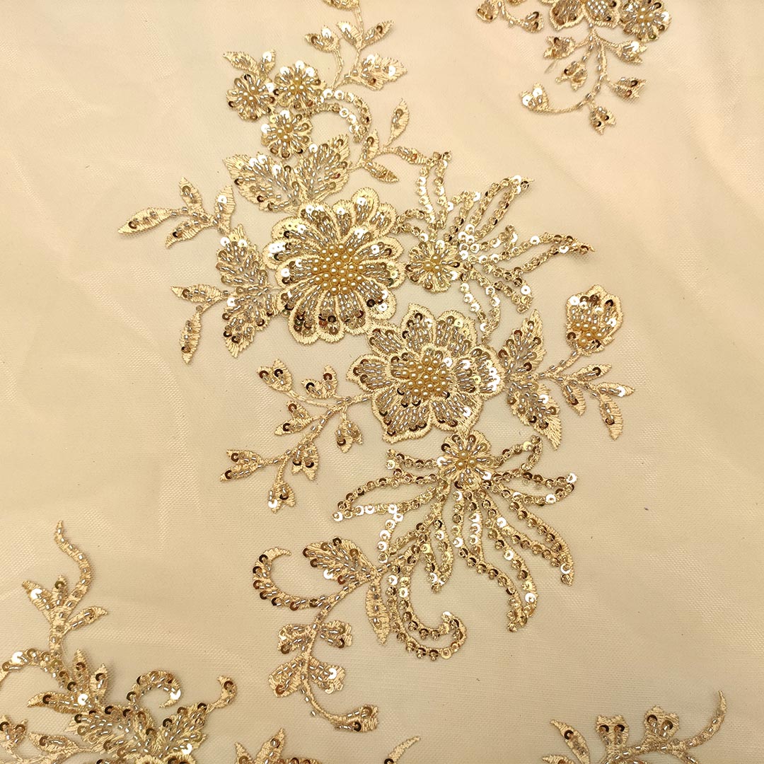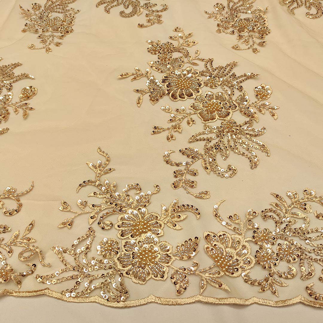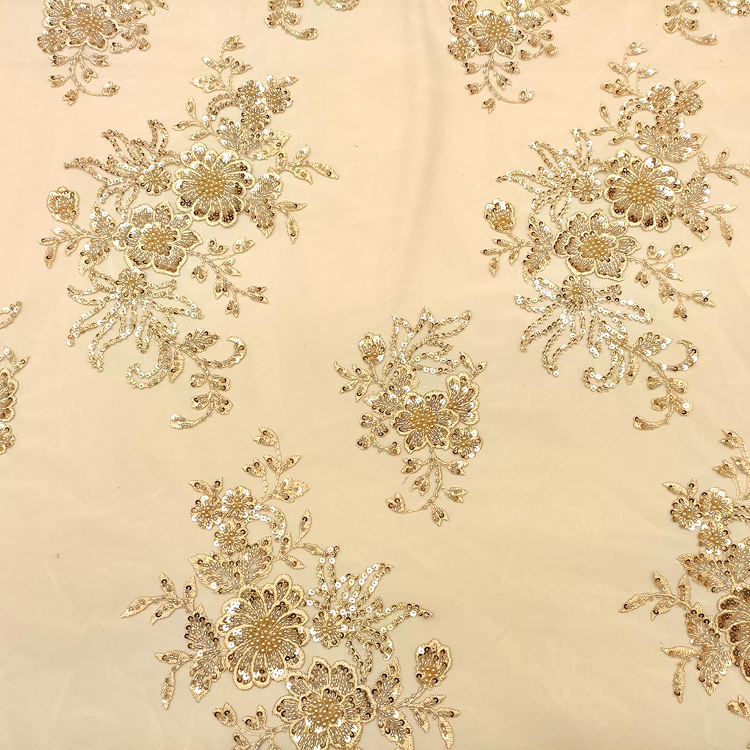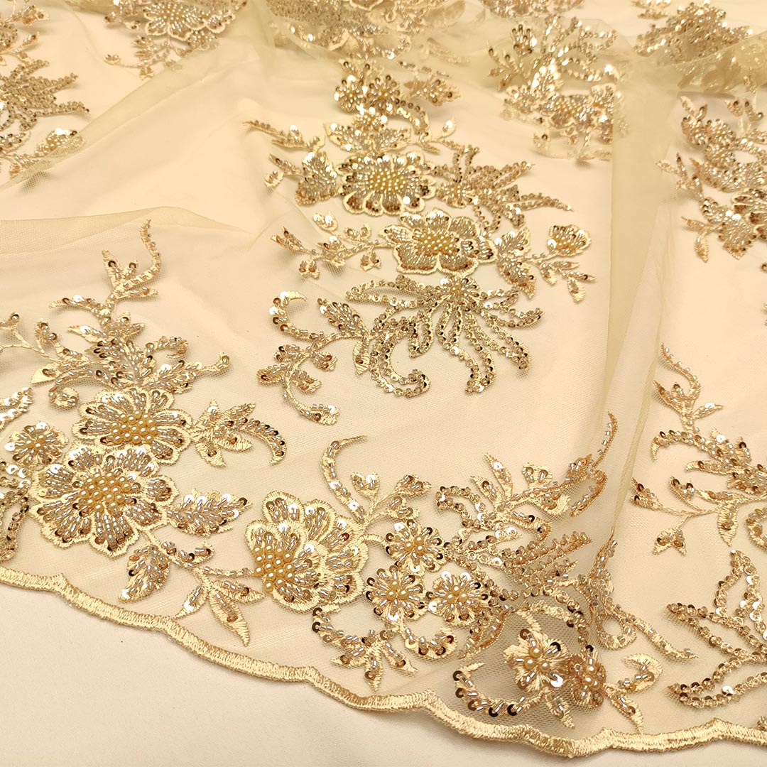 Tessuto Tulle mano seta ricamato con paillettes e con perline motivo floreale oro