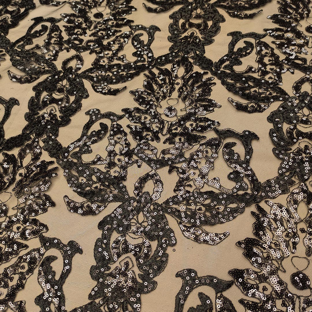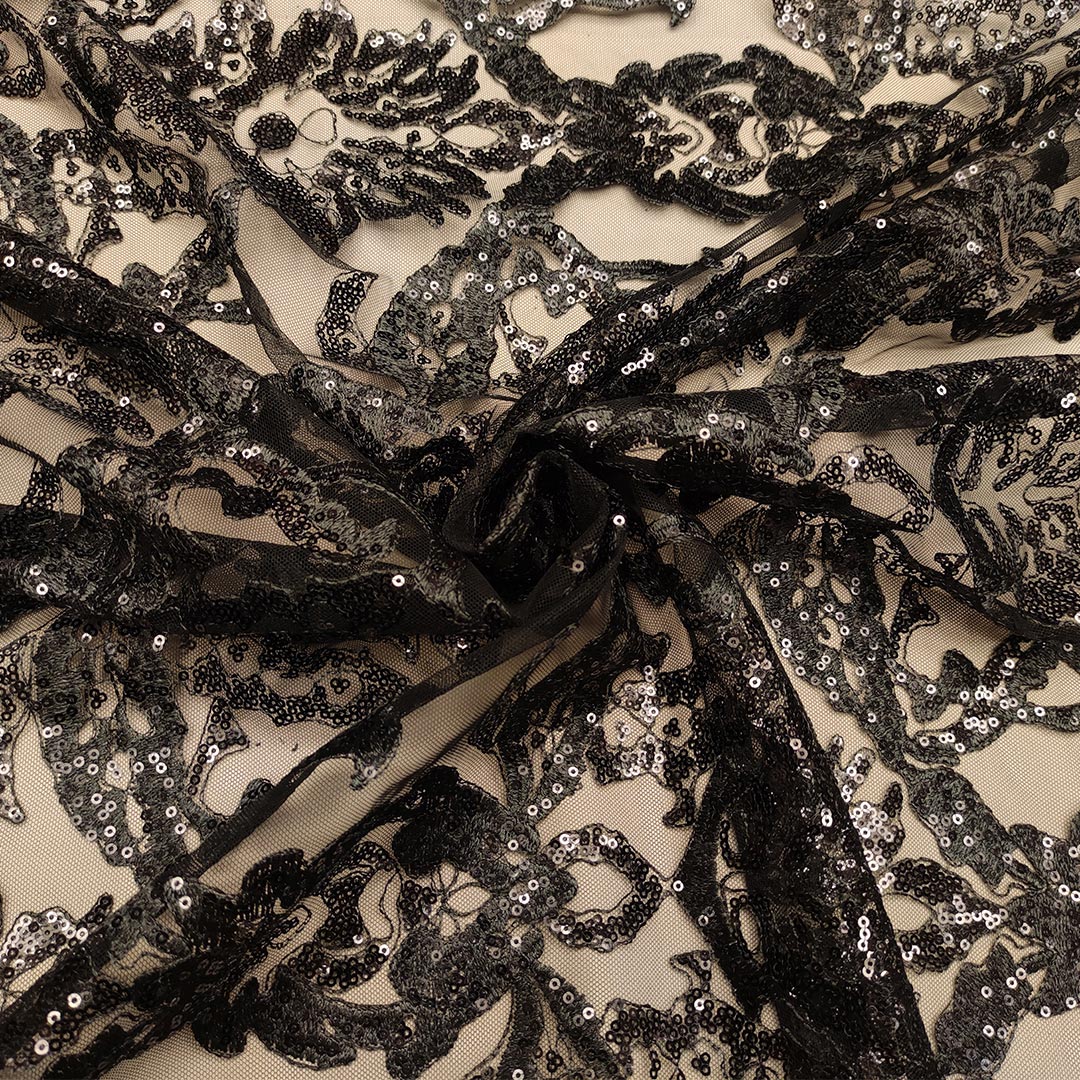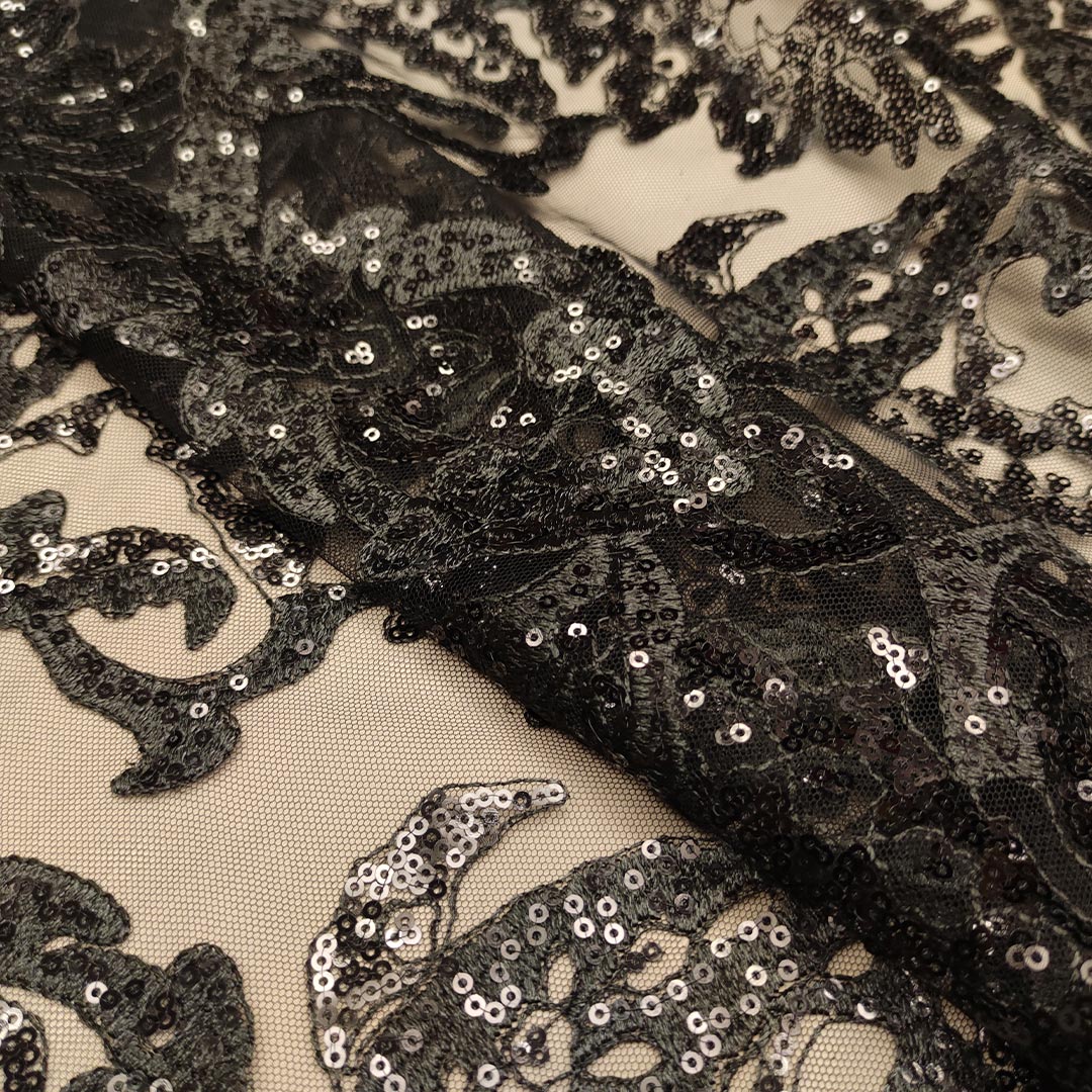 Tessuto Tulle mano seta ricamato con paillettes motivo etnico nero