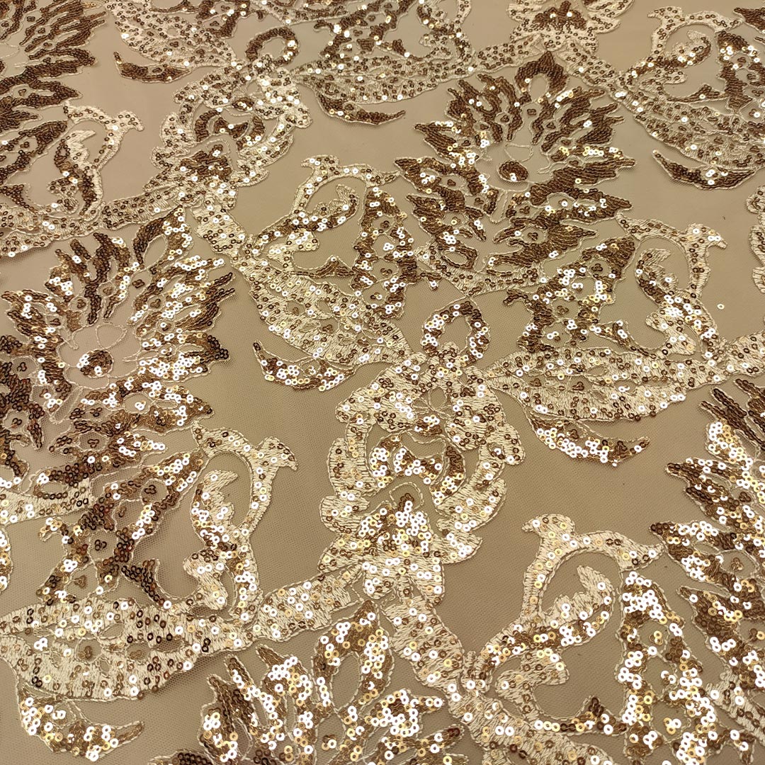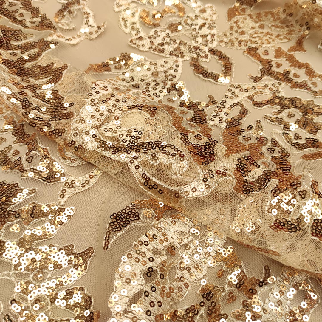 Tessuto Tulle mano seta ricamato con paillettes motivo etnico oro