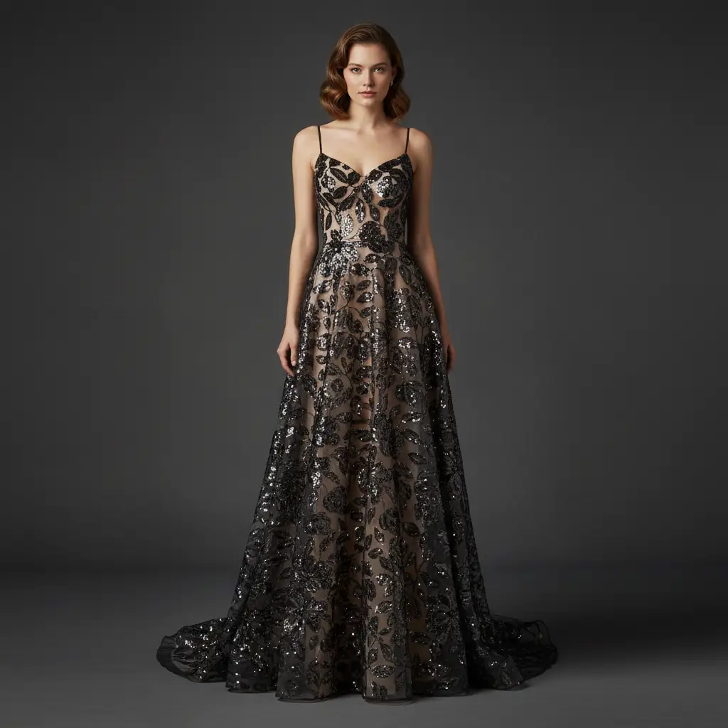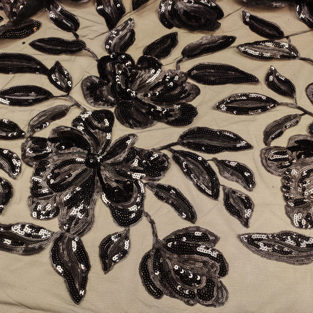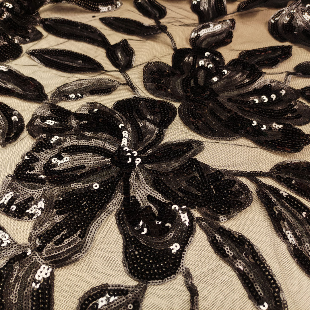 Tessuto Tulle mano seta ricamato con paillettes motivo floreale nero – antracite