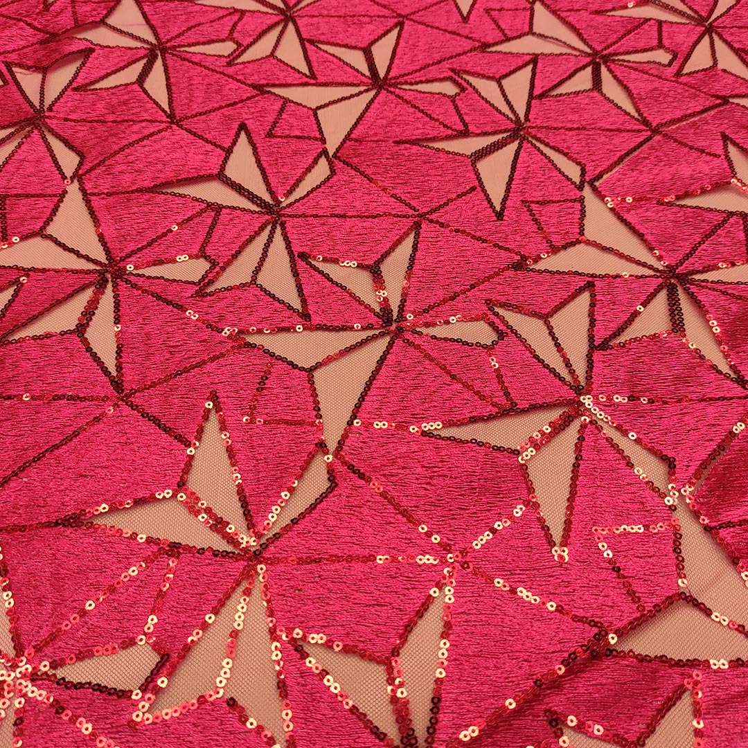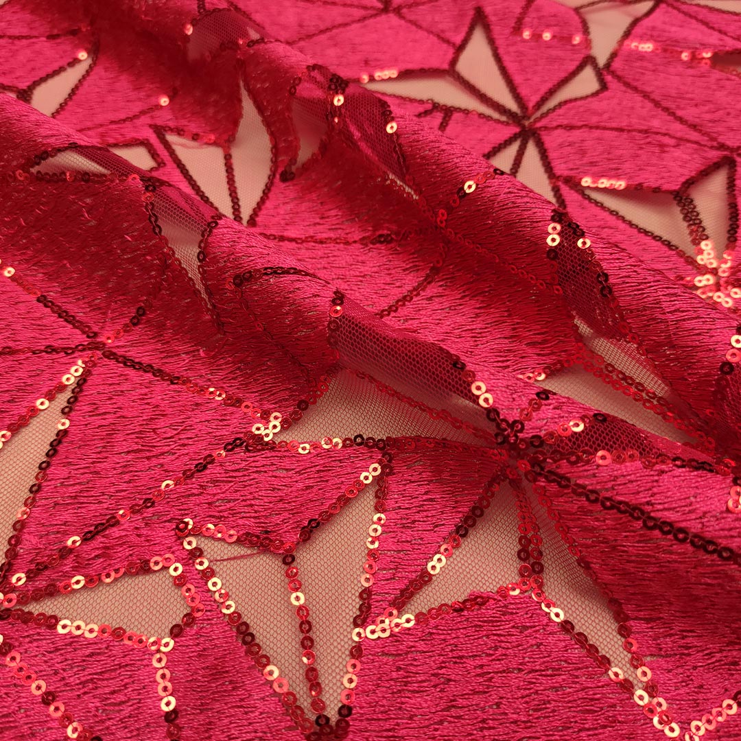 Tessuto Tulle mano seta ricamato con paillettes motivo geometrico ciliegio
