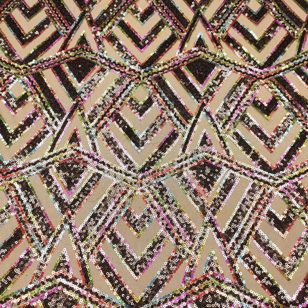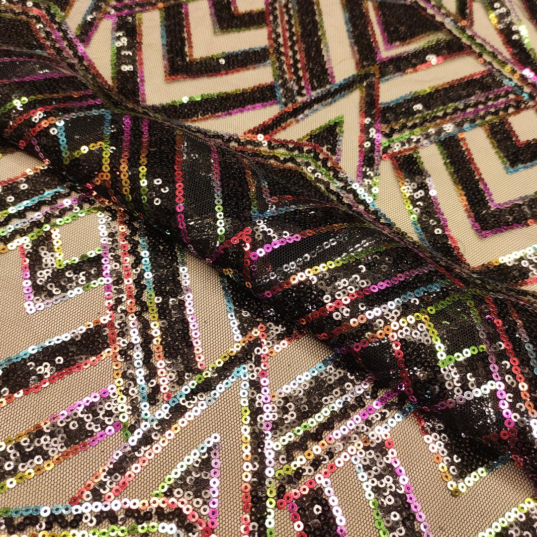 Tessuto Tulle mano seta ricamato con paillettes motivo geometrico nero – fucsia – giallo – verde