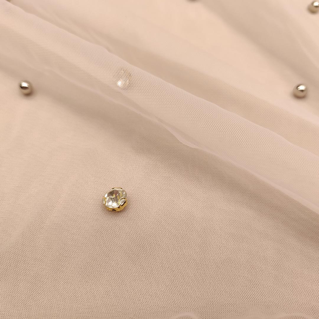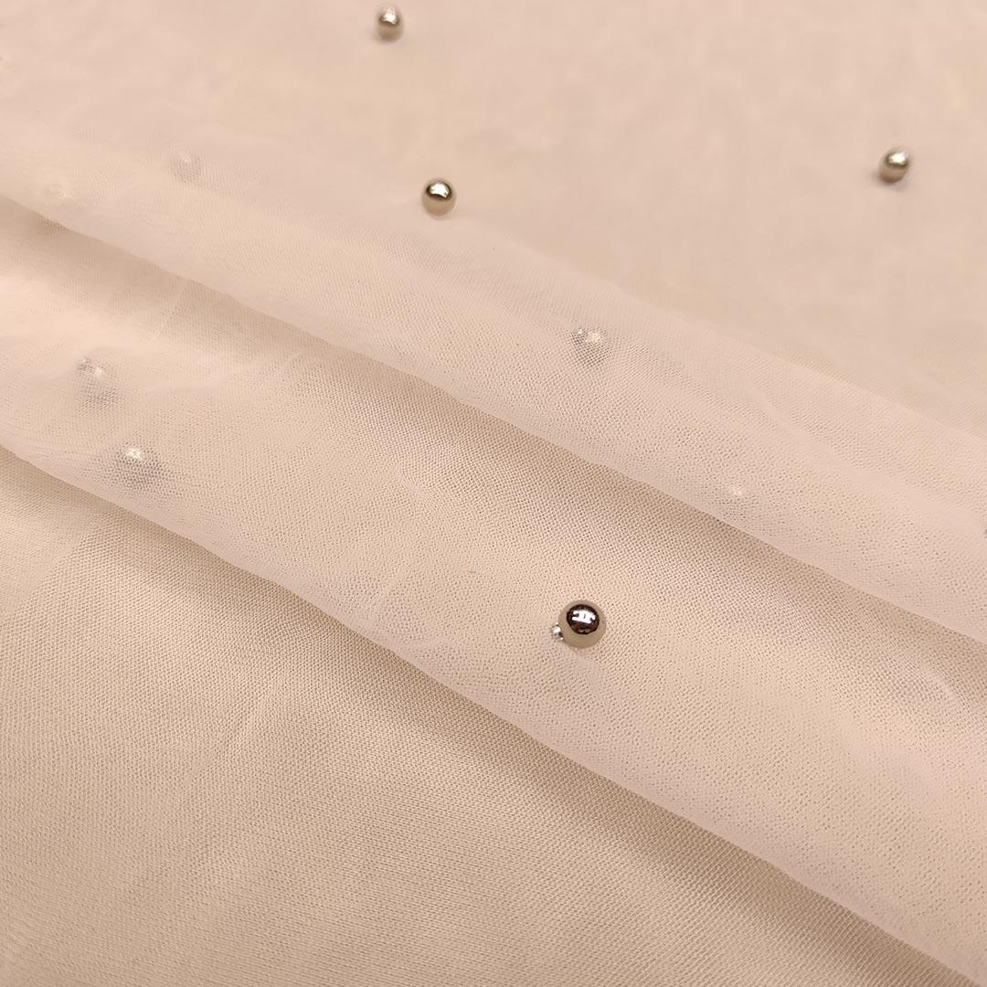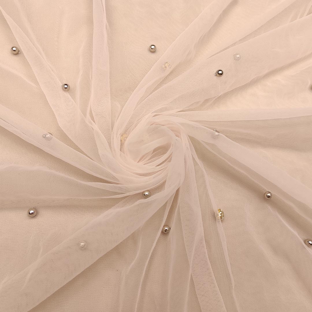 Tessuto Tulle mano seta ricamato con perle e con cristalli ideale per realizzare capi da cerimonia esclusivi ed eleganti.