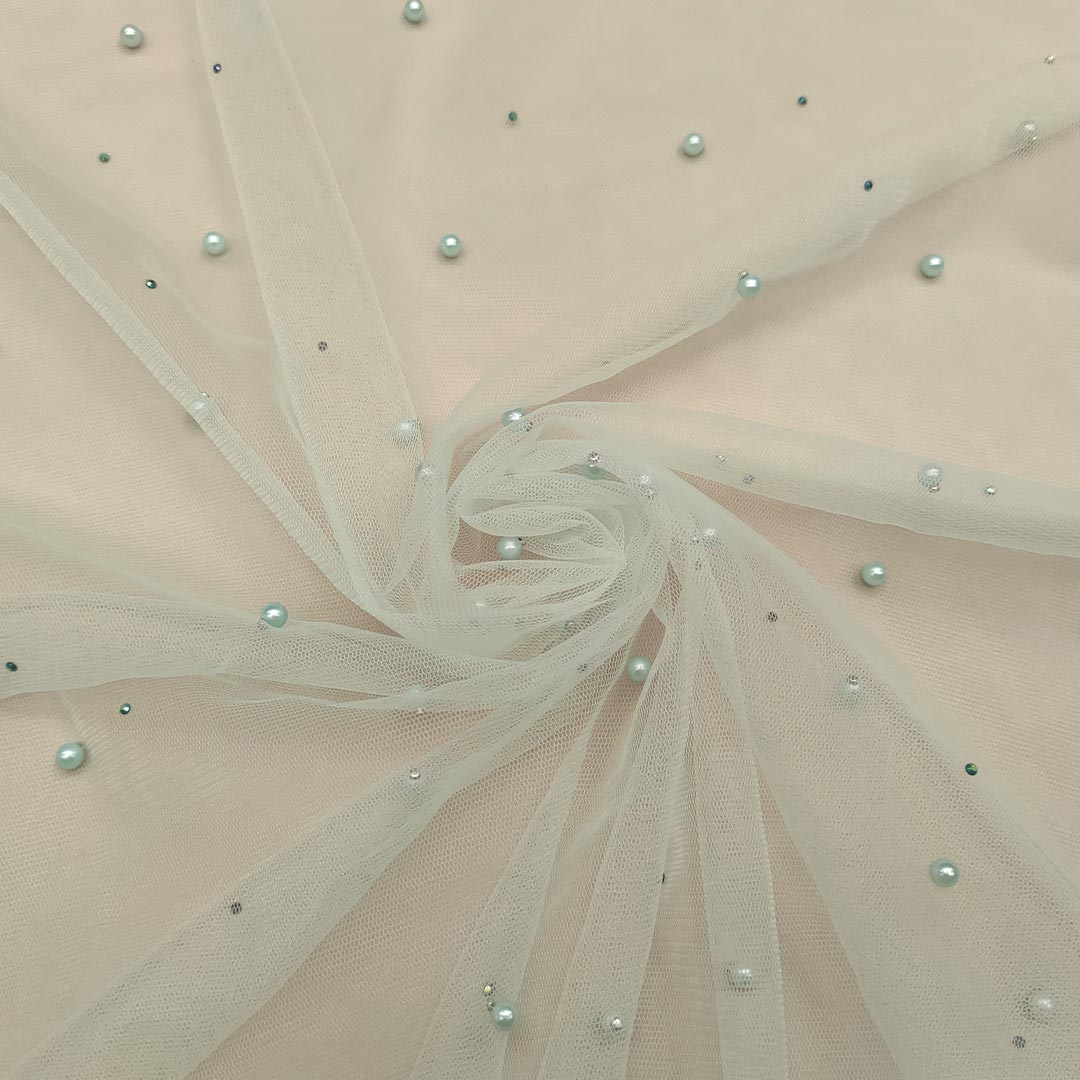 Tessuto Tulle mano seta ricamato con perle e con strass ideale per realizzare capi da cerimonia esclusivi ed eleganti.