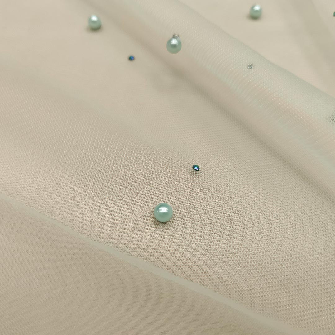 Tessuto Tulle mano seta ricamato con perle e con strass acquamarina