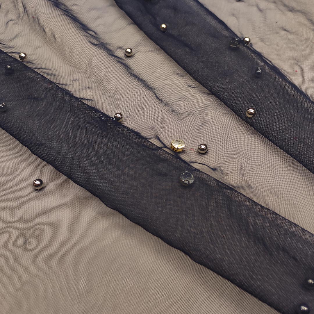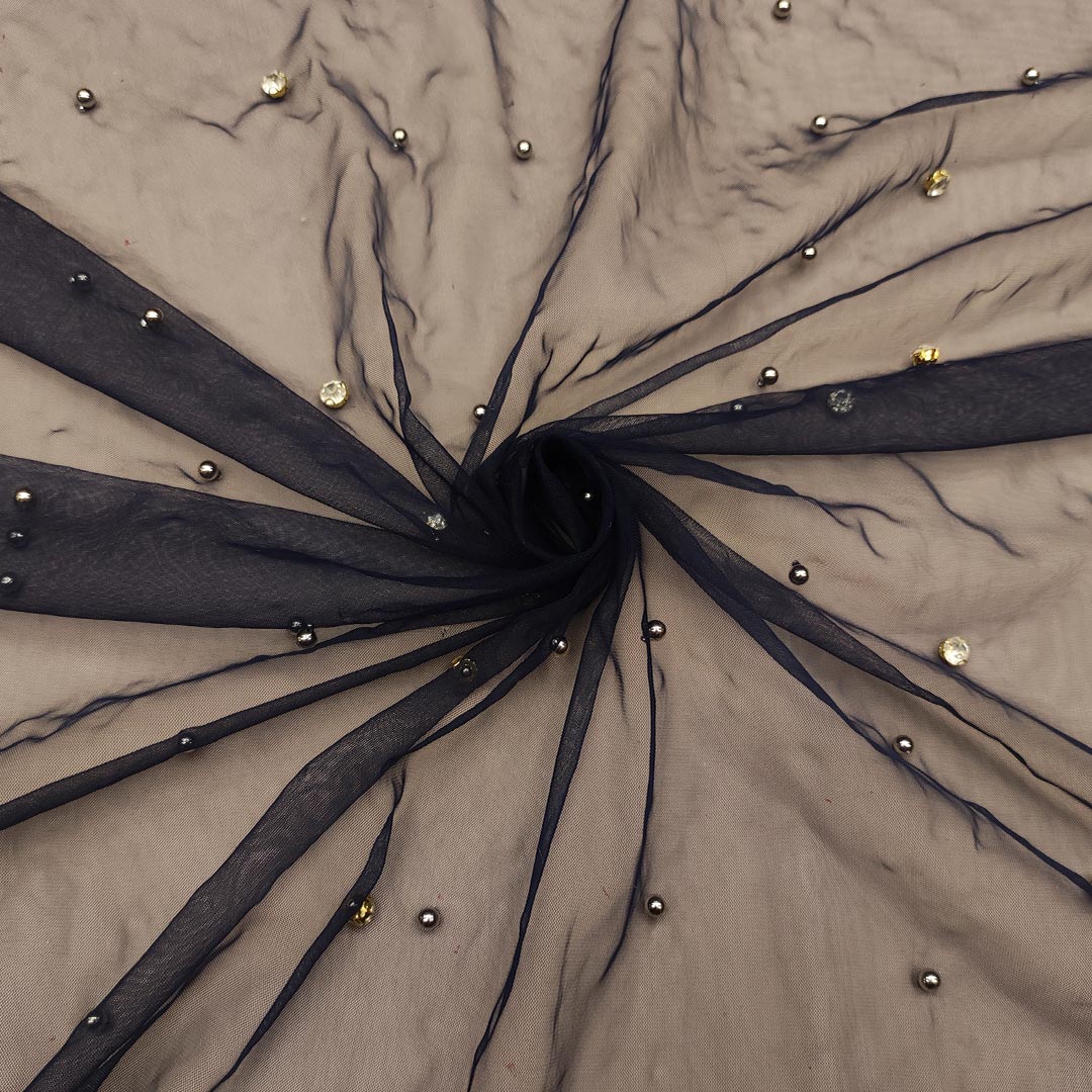 Tessuto Tulle mano seta ricamato con perle e con strass blu
