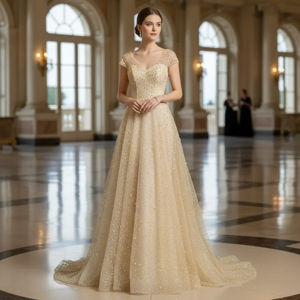 Tessuto Tulle mano seta ricamato con perle e con strass ideale per realizzare capi da cerimonia esclusivi ed eleganti.