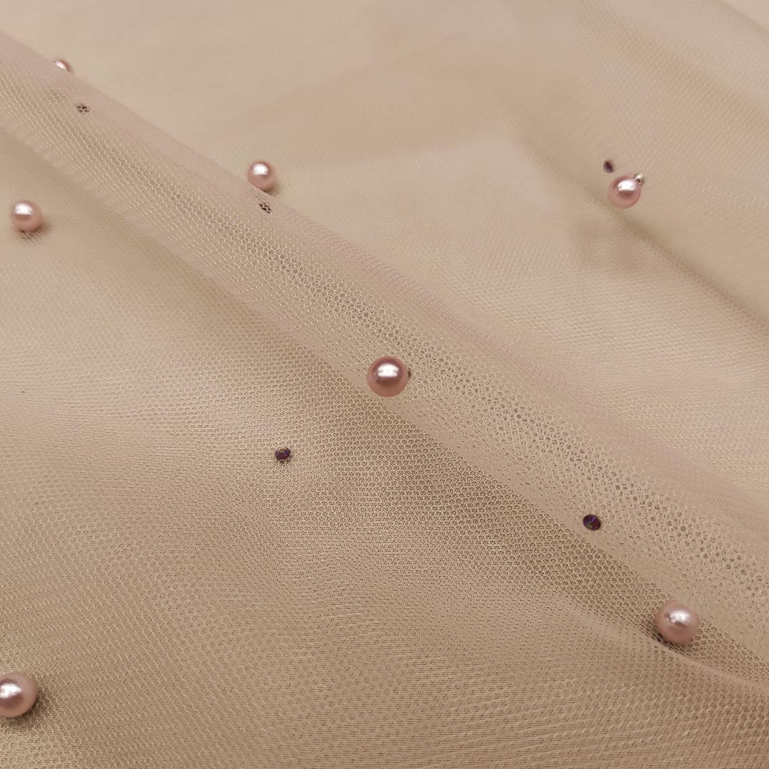 Tessuto Tulle mano seta ricamato con perle e con strass rosa