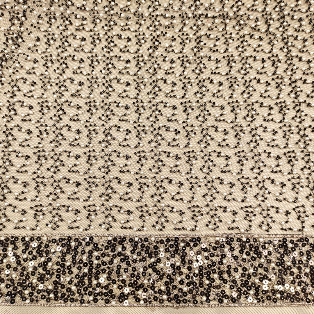 Tessuto Tulle mano seta ricamato con perle e pietre motivo astratto bianco – nero