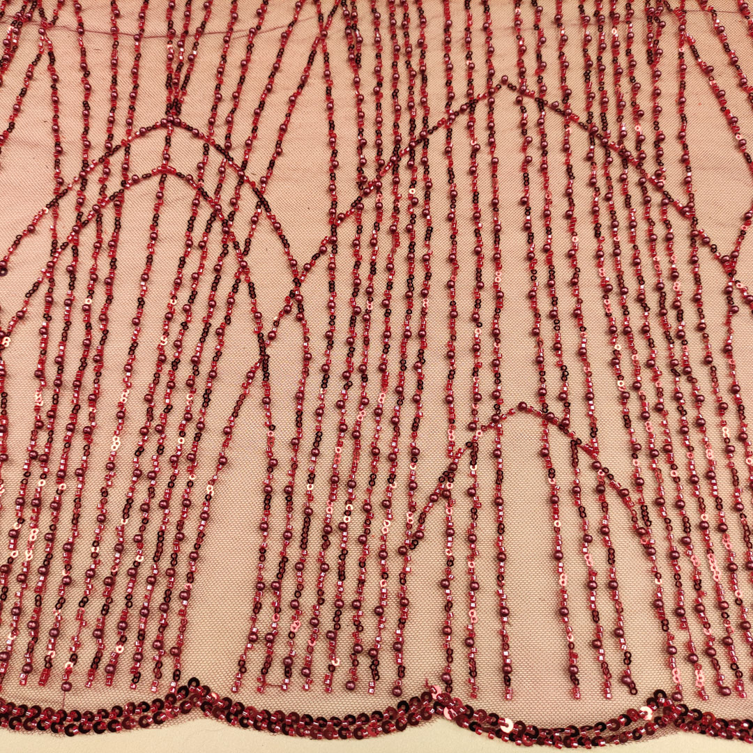 Tessuto Tulle mano seta ricamato con perle e pietre motivo astratto rosso