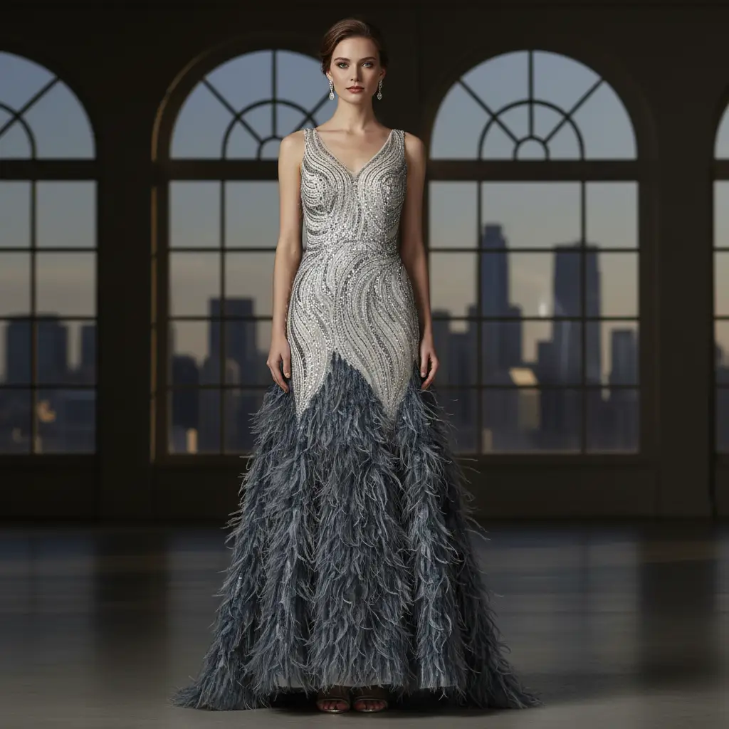 Tessuto Tulle mano seta ricamato con perline con paillettes e con piume ideale per realizzare capi da cerimonia esclusivi ed eleganti.