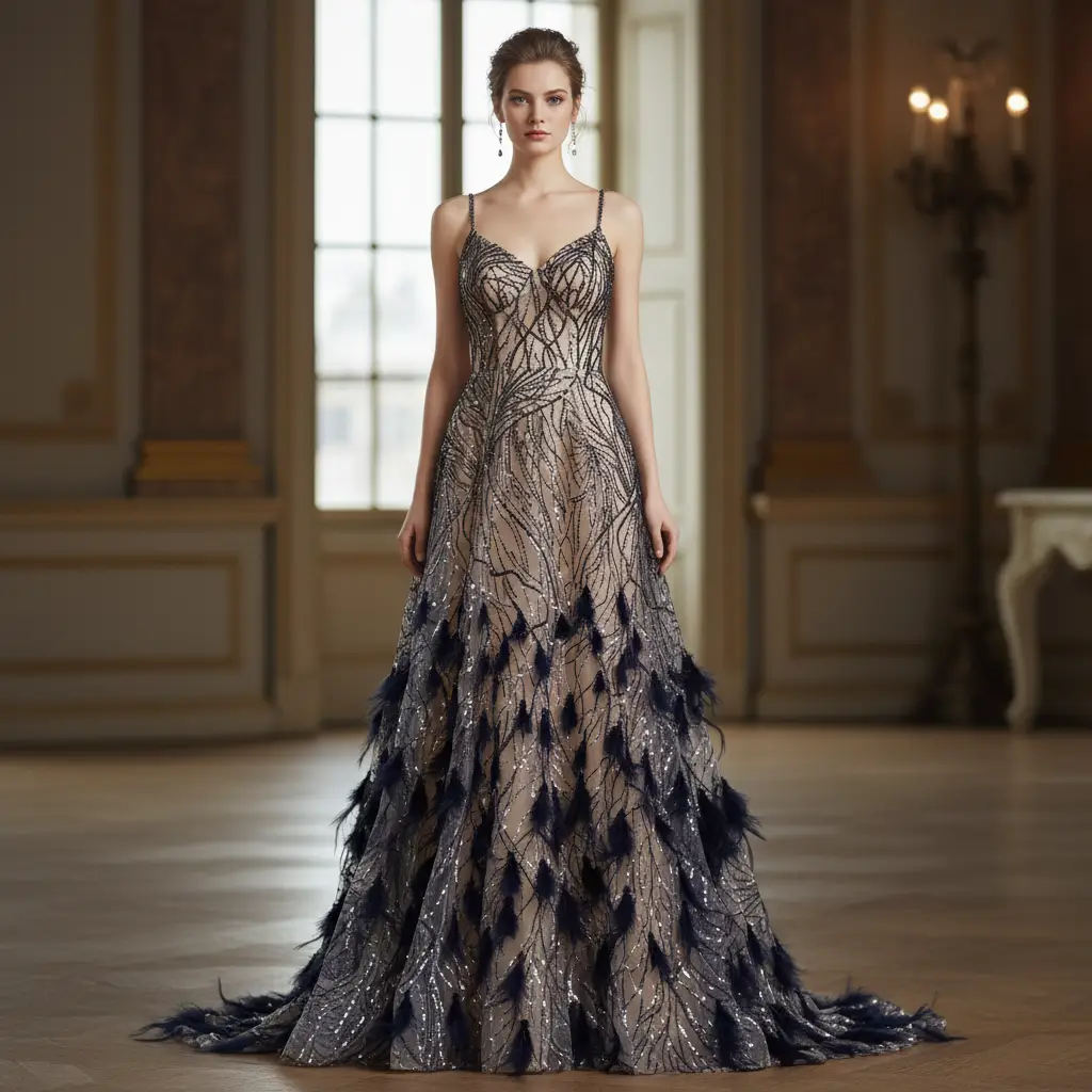 Tessuto Tulle mano seta ricamato con perline con paillettes e con piume ideale per realizzare capi da cerimonia esclusivi ed eleganti.