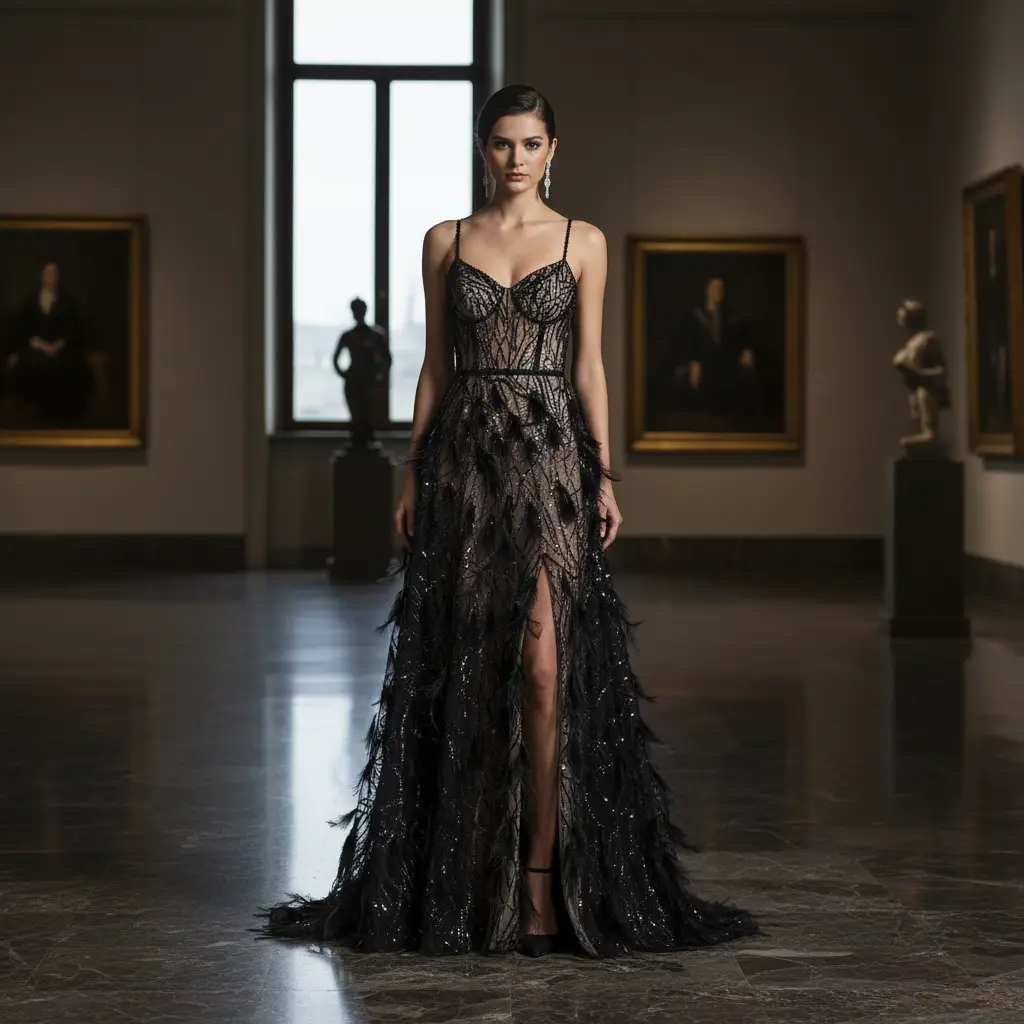 Tessuto Tulle mano seta ricamato con perline con paillettes e con piume ideale per realizzare capi da cerimonia esclusivi ed eleganti.