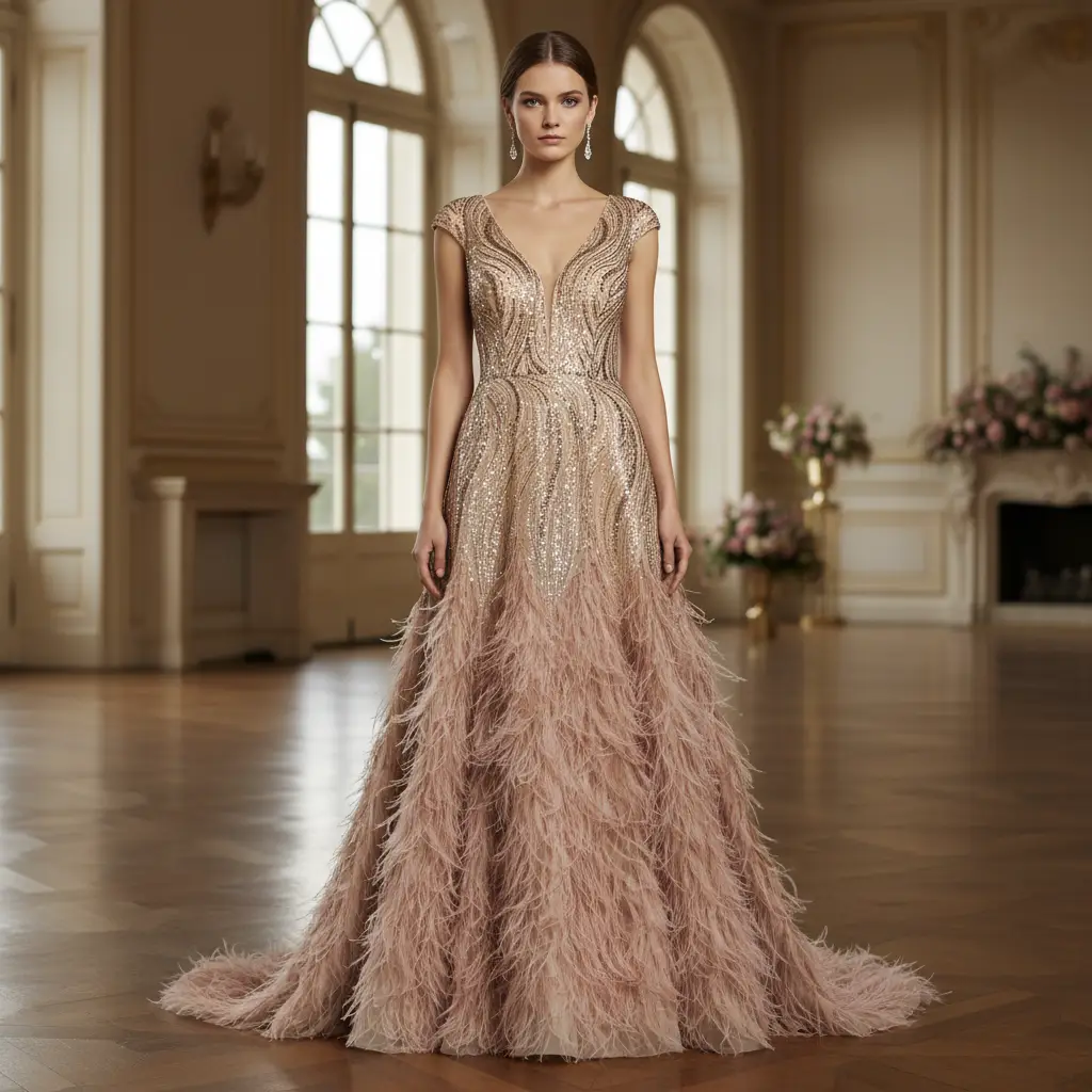 Tessuto Tulle mano seta ricamato con perline con paillettes e con piume ideale per realizzare capi da cerimonia esclusivi ed eleganti.