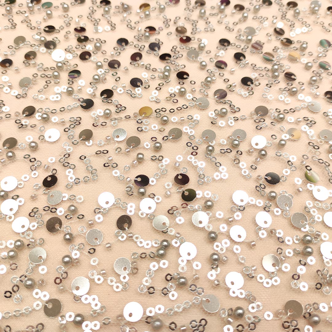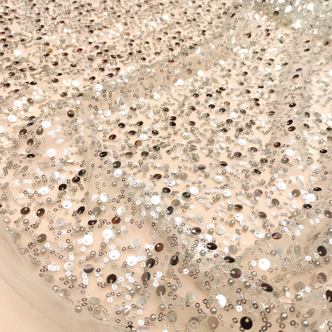 Tessuto Tulle mano seta ricamato con perline e con paillettes ideale per realizzare capi da cerimonia esclusivi ed eleganti.