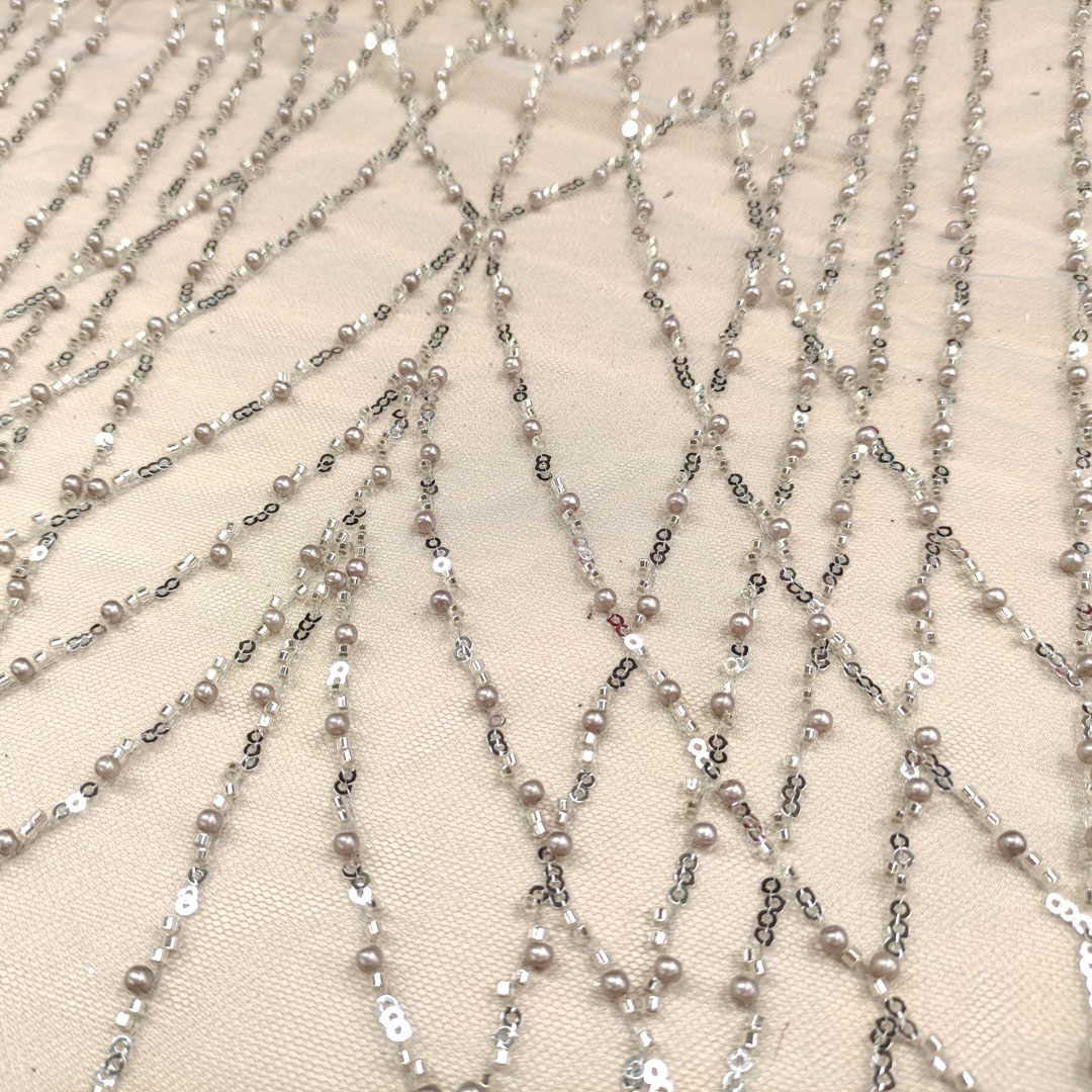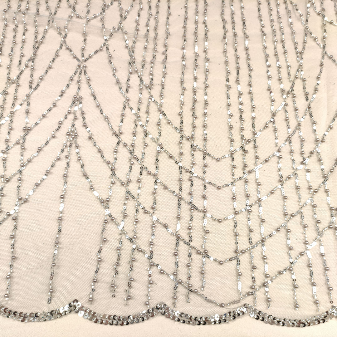 Tessuto Tulle mano seta ricamato con perline e paillettes motivo astratto argento