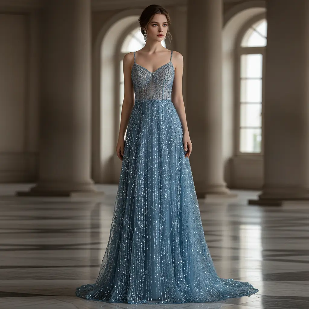 Tessuto Tulle a rete ricamato con perline con paillettes ideale per realizzare capi da cerimonia esclusivi ed eleganti.