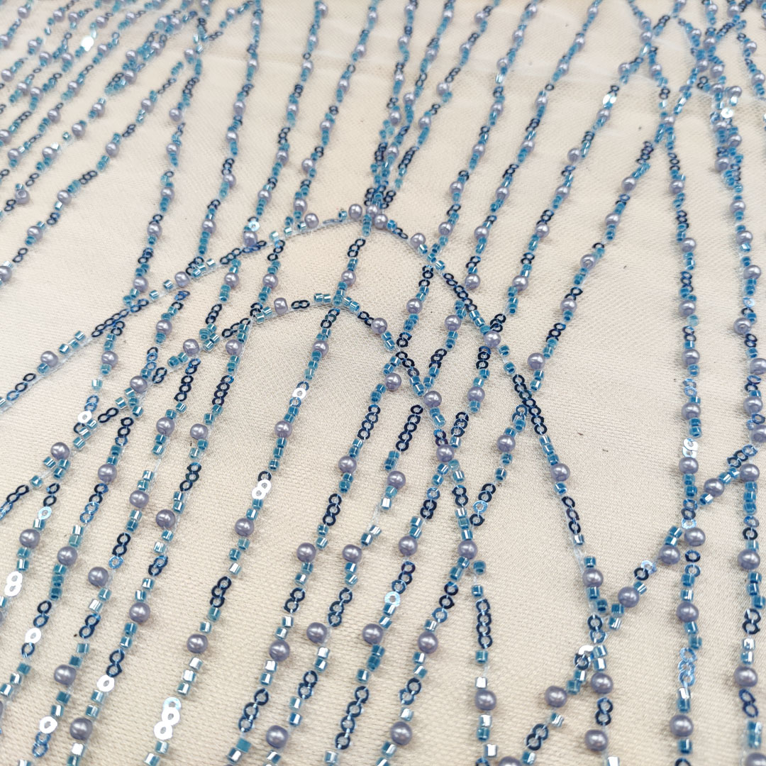 Tessuto Tulle mano seta ricamato con perline e paillettes motivo astratto azzurro
