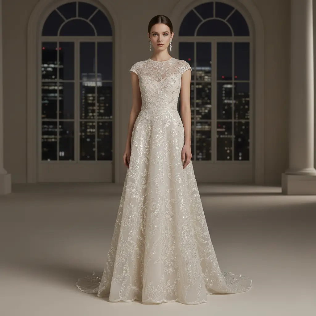 Tessuto Tulle a rete ricamato con perline con paillettes ideale per realizzare capi da cerimonia esclusivi ed eleganti.