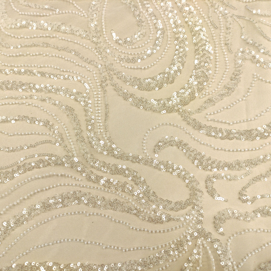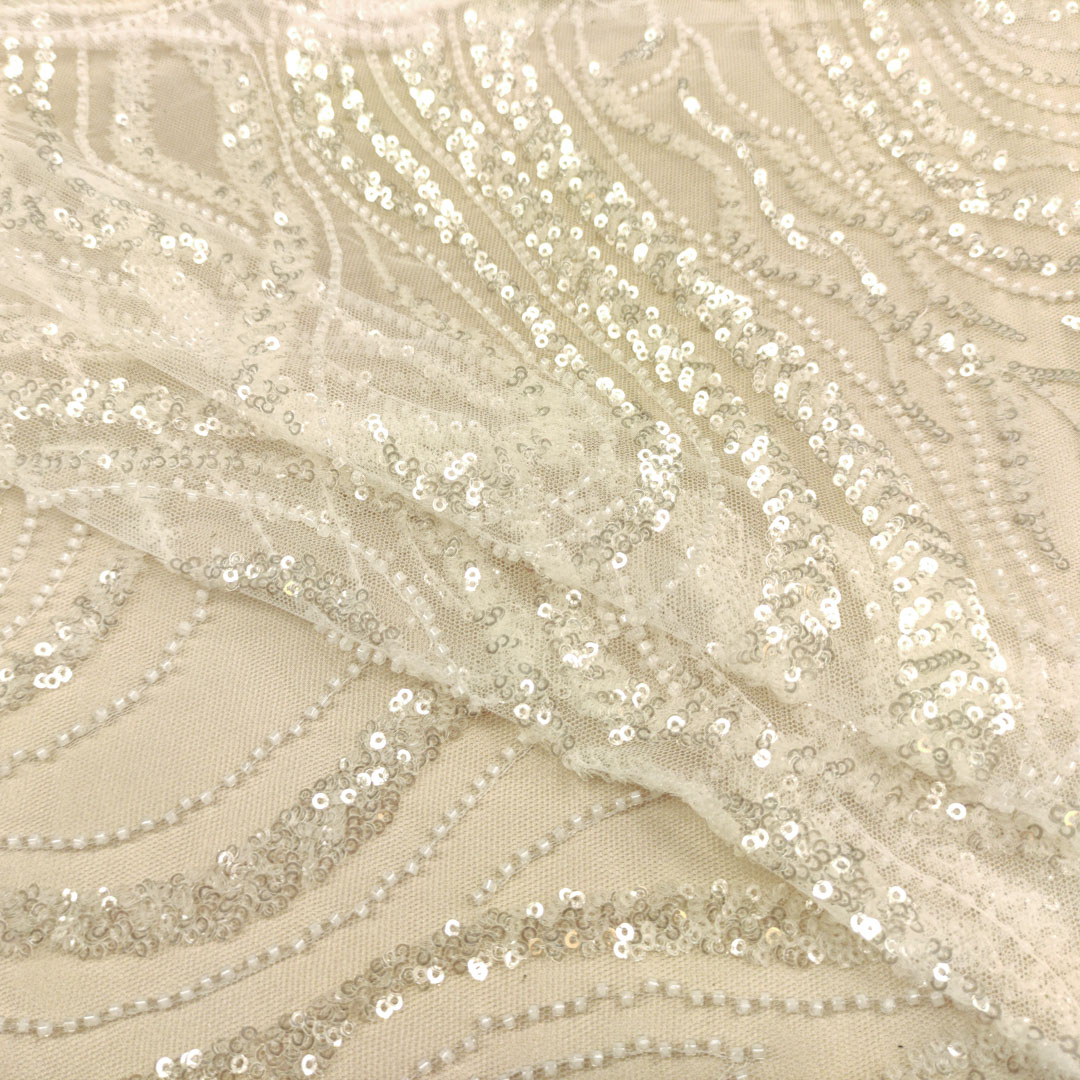 Tessuto Tulle mano seta ricamato con perline e paillettes motivo astratto bianco seta