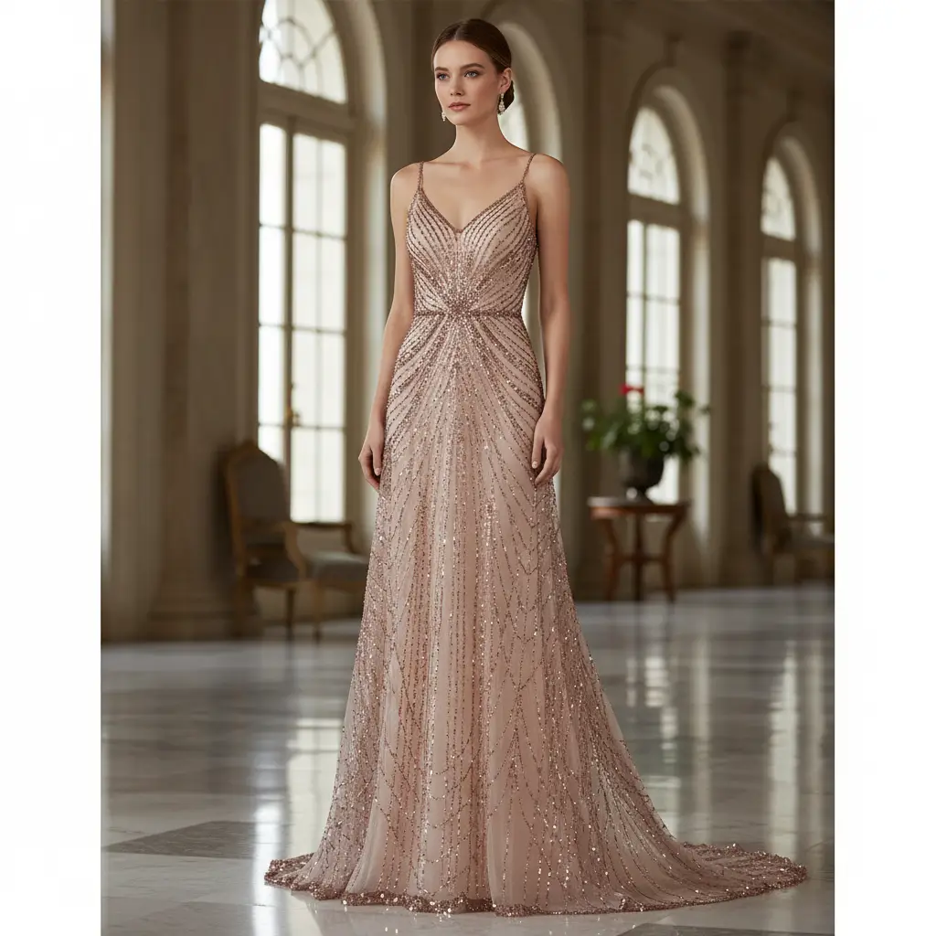 Tessuto Tulle a rete ricamato con perline con paillettes ideale per realizzare capi da cerimonia esclusivi ed eleganti.