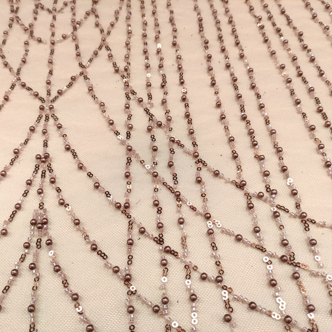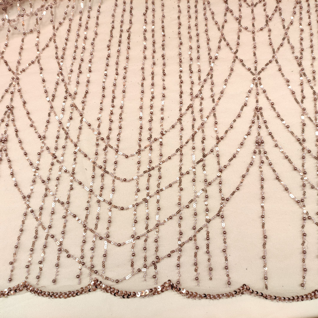 Tessuto Tulle mano seta ricamato con perline e paillettes motivo astratto bronzo