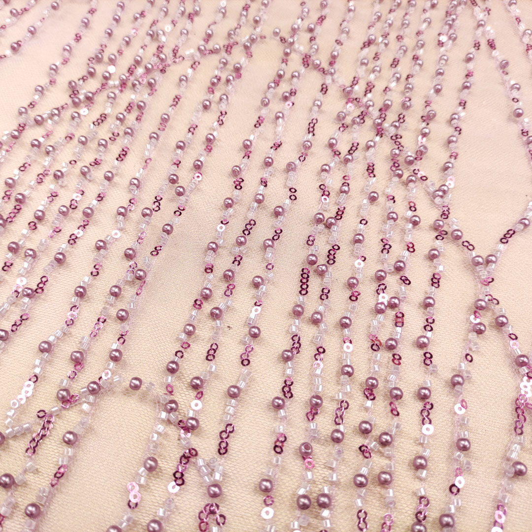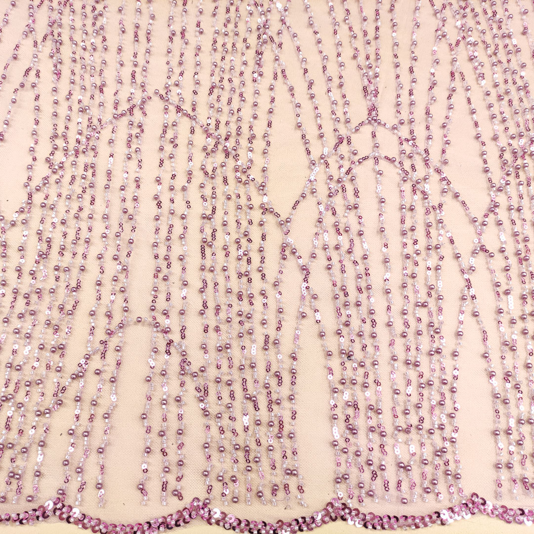 Tessuto Tulle mano seta ricamato con perline e paillettes motivo astratto lilla