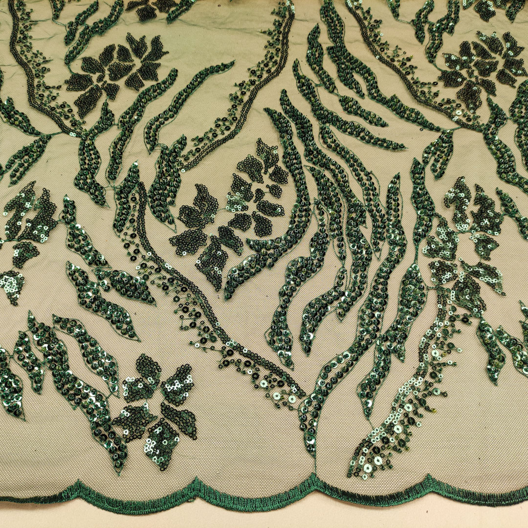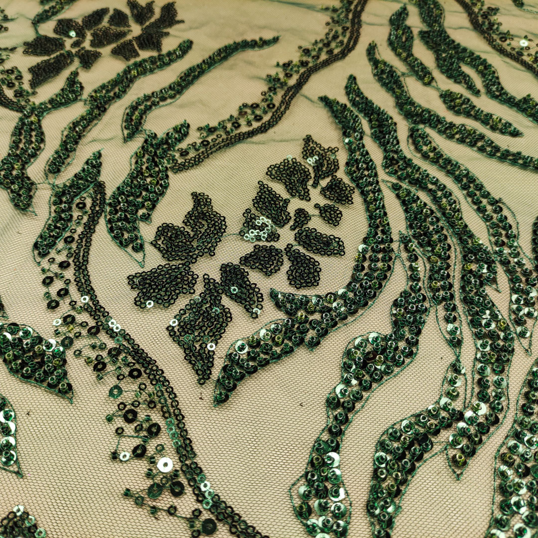 Tessuto Tulle mano seta ricamato con perline e paillettes motivo astratto verde