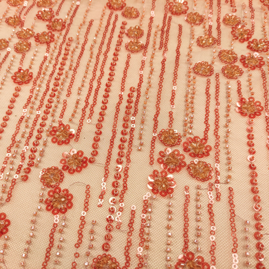 Tessuto Tulle mano seta ricamato con perline e paillettes motivo floreale arancione