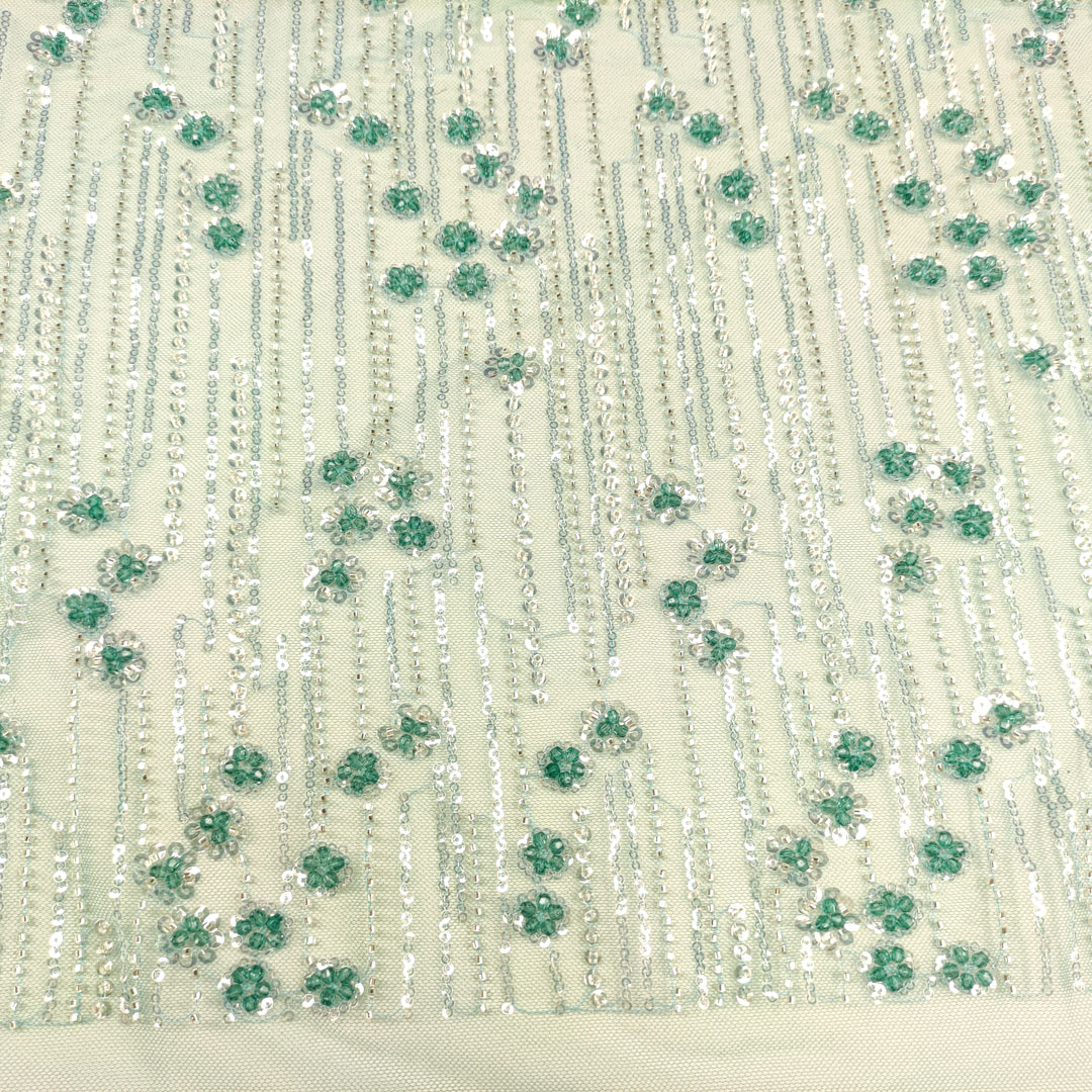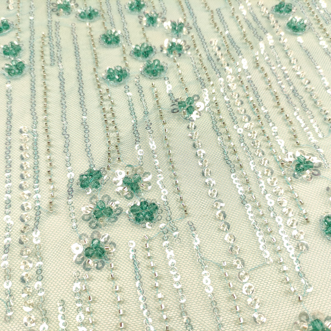 Tessuto Tulle mano seta ricamato con perline e paillettes motivo floreale argento – smeraldo
