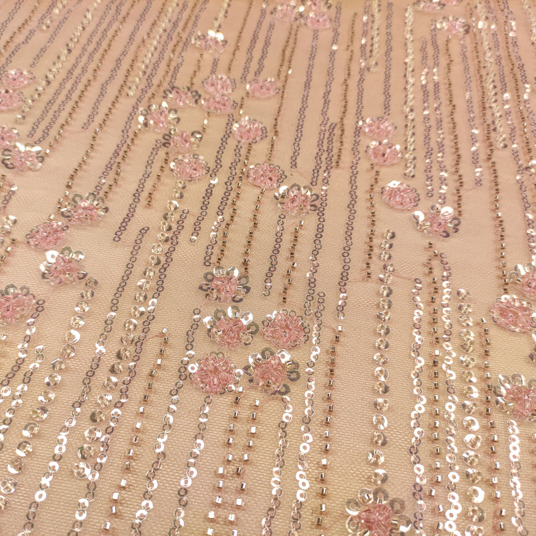Tessuto Tulle mano seta ricamato con perline e paillettes motivo floreale bianco – rosa