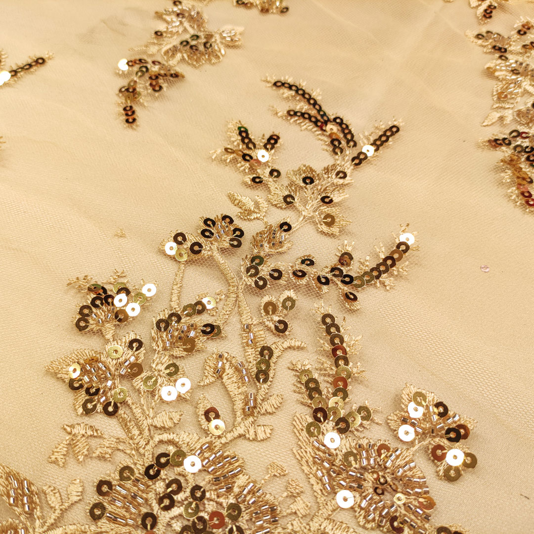 Tessuto Tulle mano seta ricamato con perline e paillettes motivo floreale oro