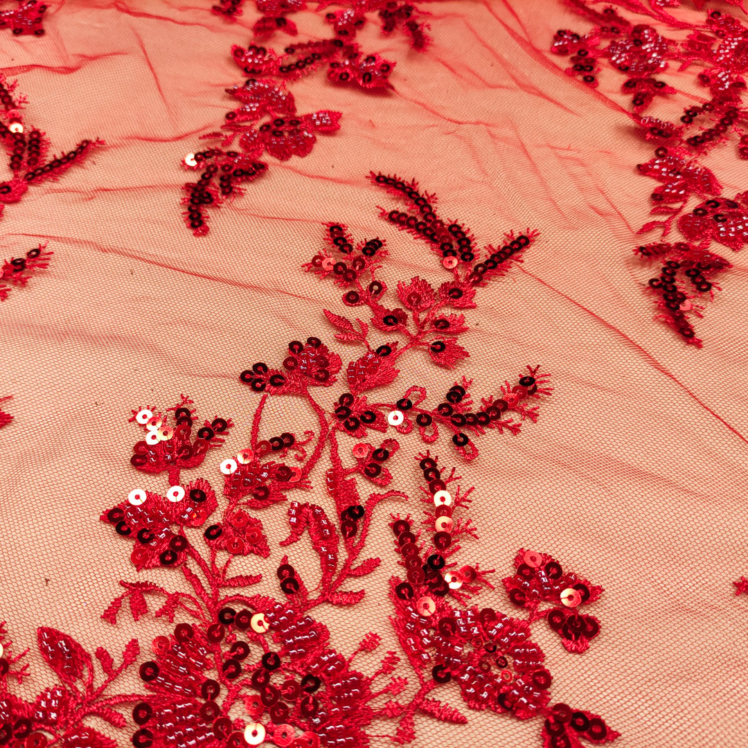 Tessuto Tulle mano seta ricamato con perline e paillettes motivo floreale rosso