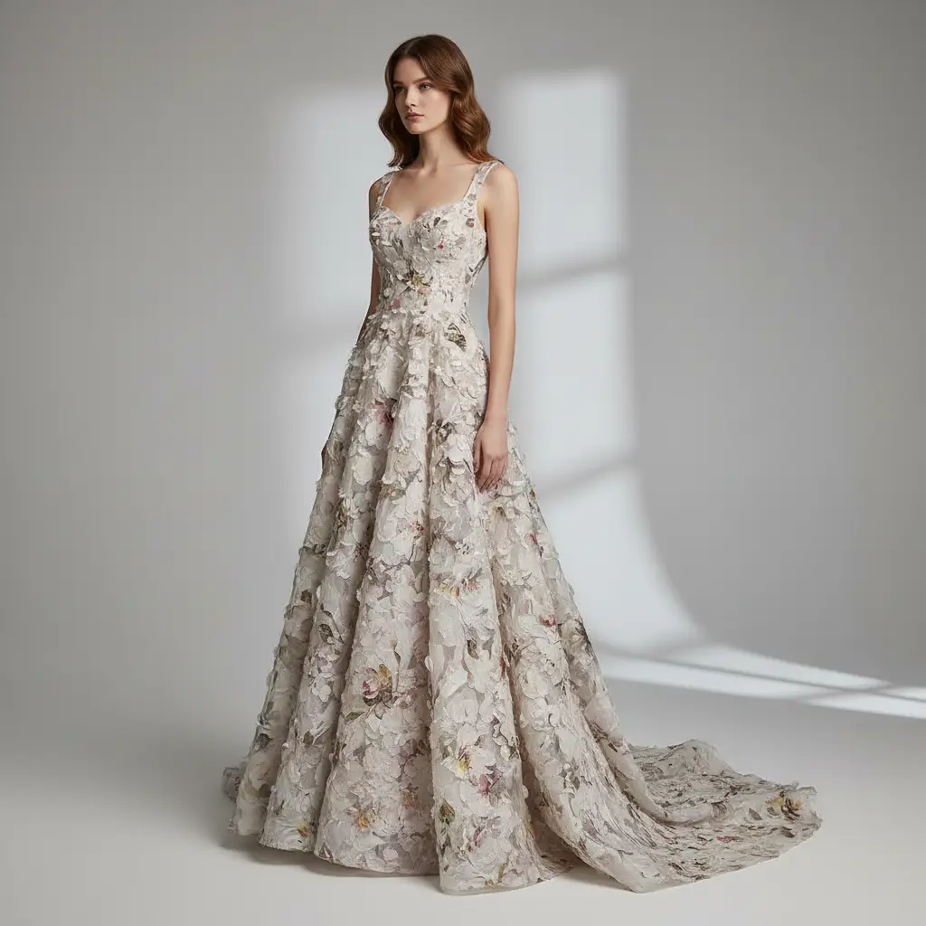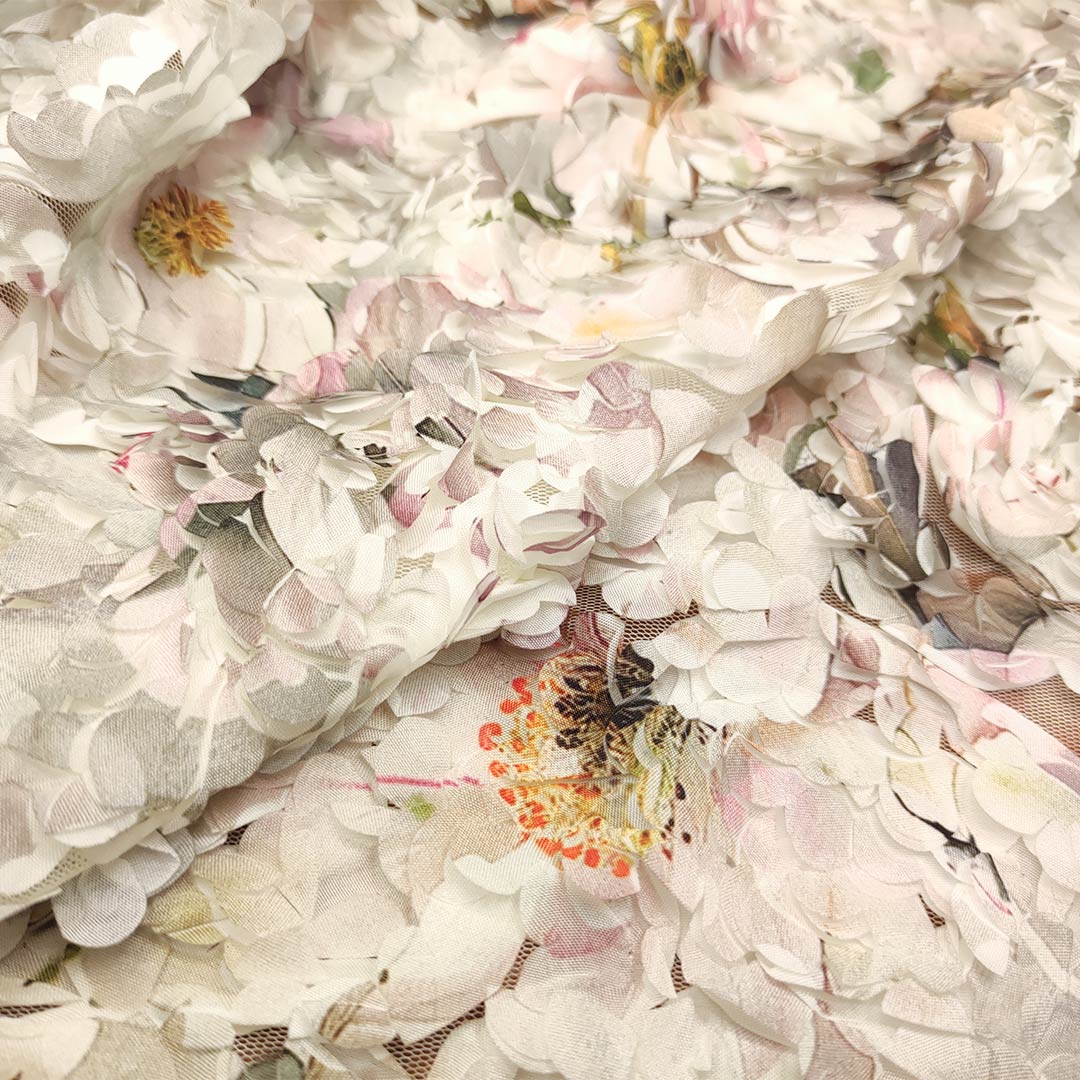 Tessuto Tulle mano seta ricamato con petali 3D dalla mano morbida, voluminosa e fluente, ideale per creare capi sartoriali da cerimonia e per le grandi occasioni originali e alla moda.