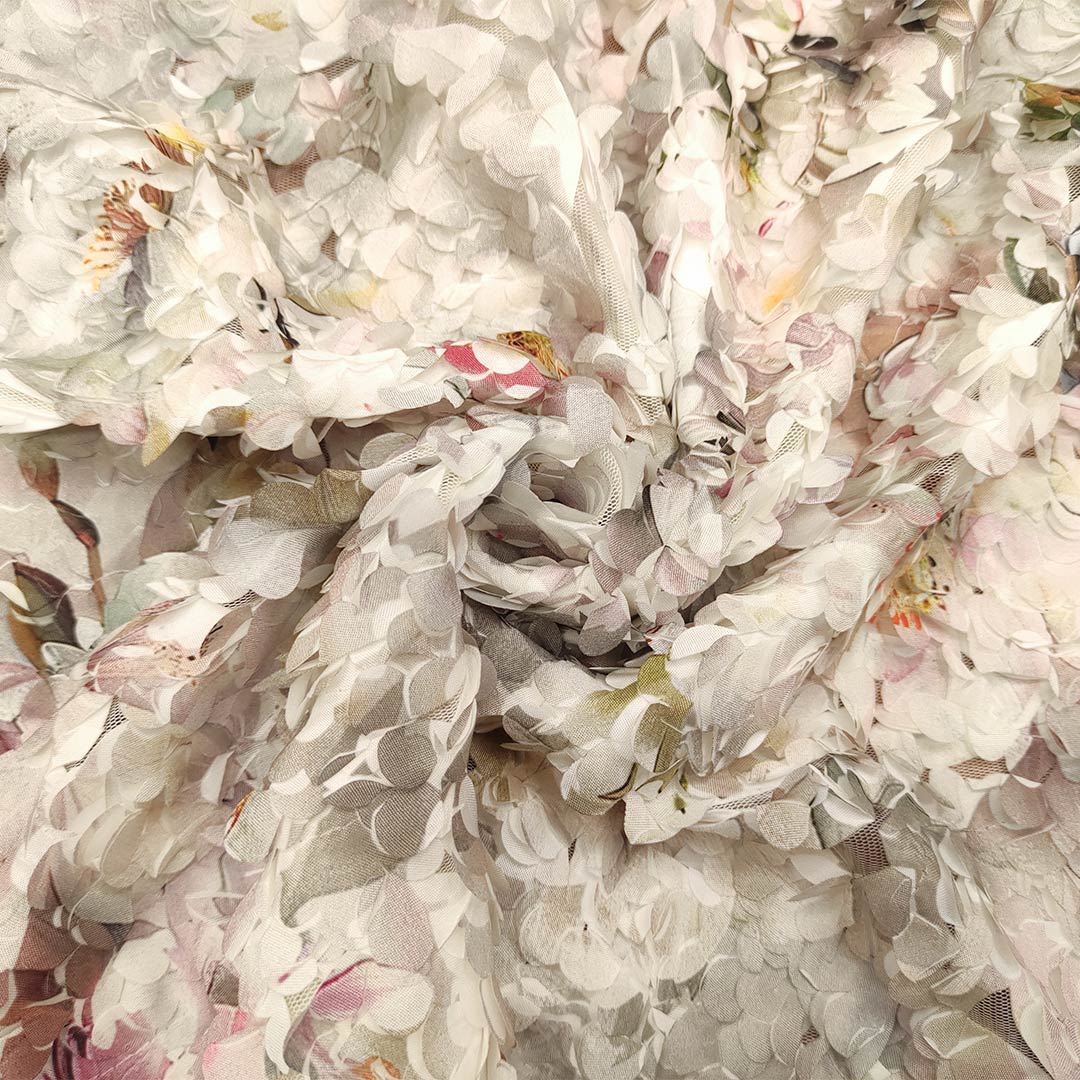 Tessuto Tulle mano seta ricamato con petali in 3D a fantasia motivo floreale bianco – grigio – rosa antico