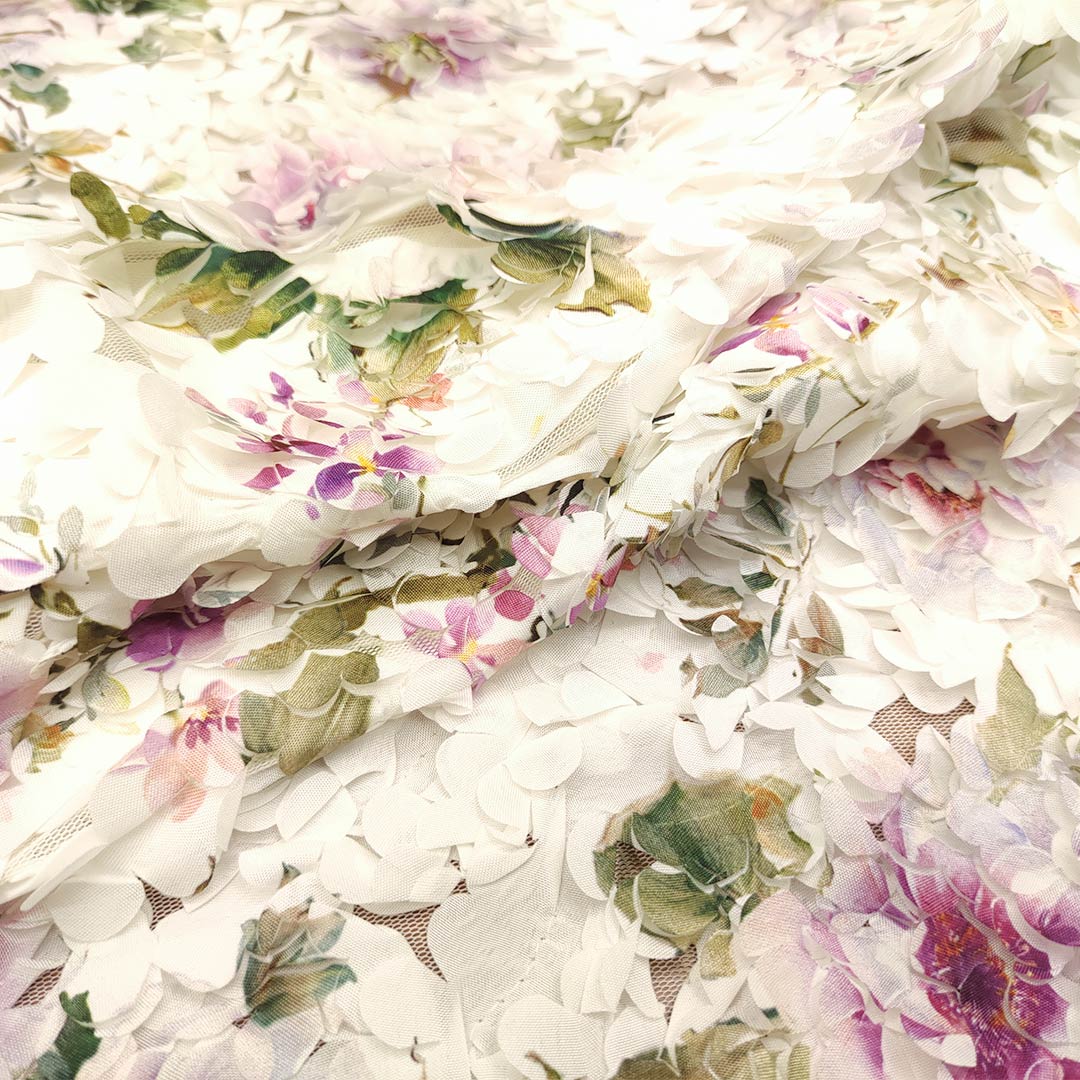 Tessuto Tulle mano seta ricamato con petali in 3D a fantasia motivo floreale bianco – viola – verde
