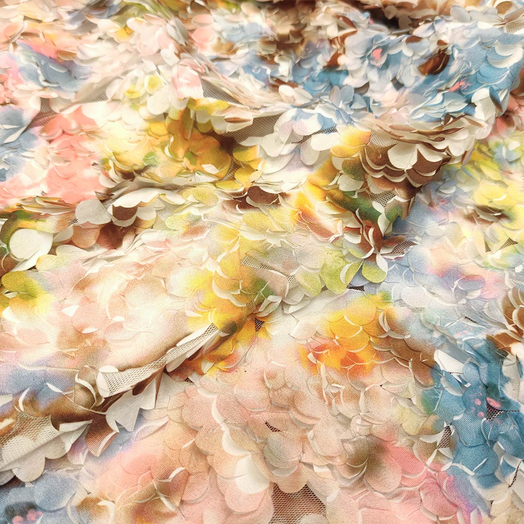 Tessuto Tulle mano seta ricamato con petali 3D dalla mano morbida, voluminosa e fluente, ideale per creare capi sartoriali da cerimonia e per le grandi occasioni originali e alla moda.