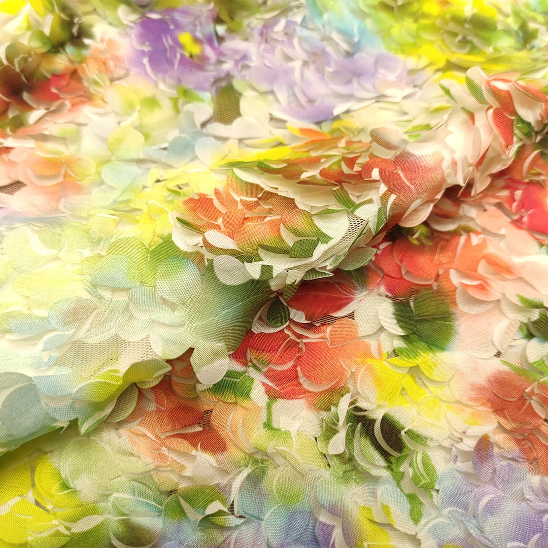 Tessuto Tulle mano seta ricamato con petali in 3D a fantasia motivo floreale giallo – viola – arancione