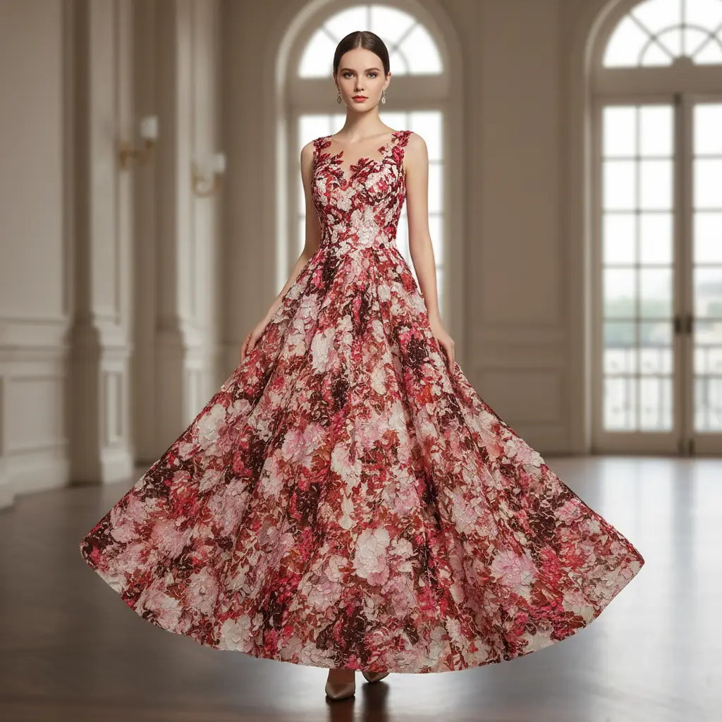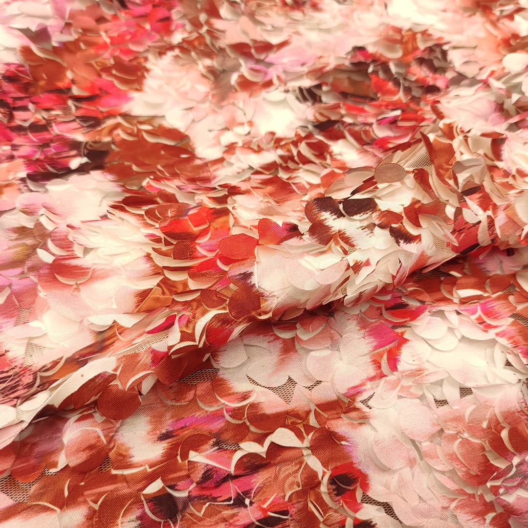 Tessuto Tulle mano seta ricamato con petali in 3D a fantasia motivo floreale rosso – bordeaux – rosa
